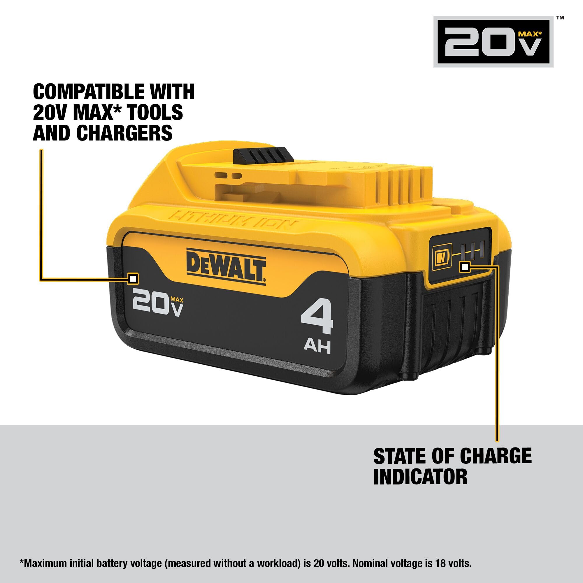 Power your 20V MAX* tools with this 20V MAX* 4Ah Battery that features the runtime and performance needed for tough jobs. This battery is compatible with 20V MAX* tools and chargers.