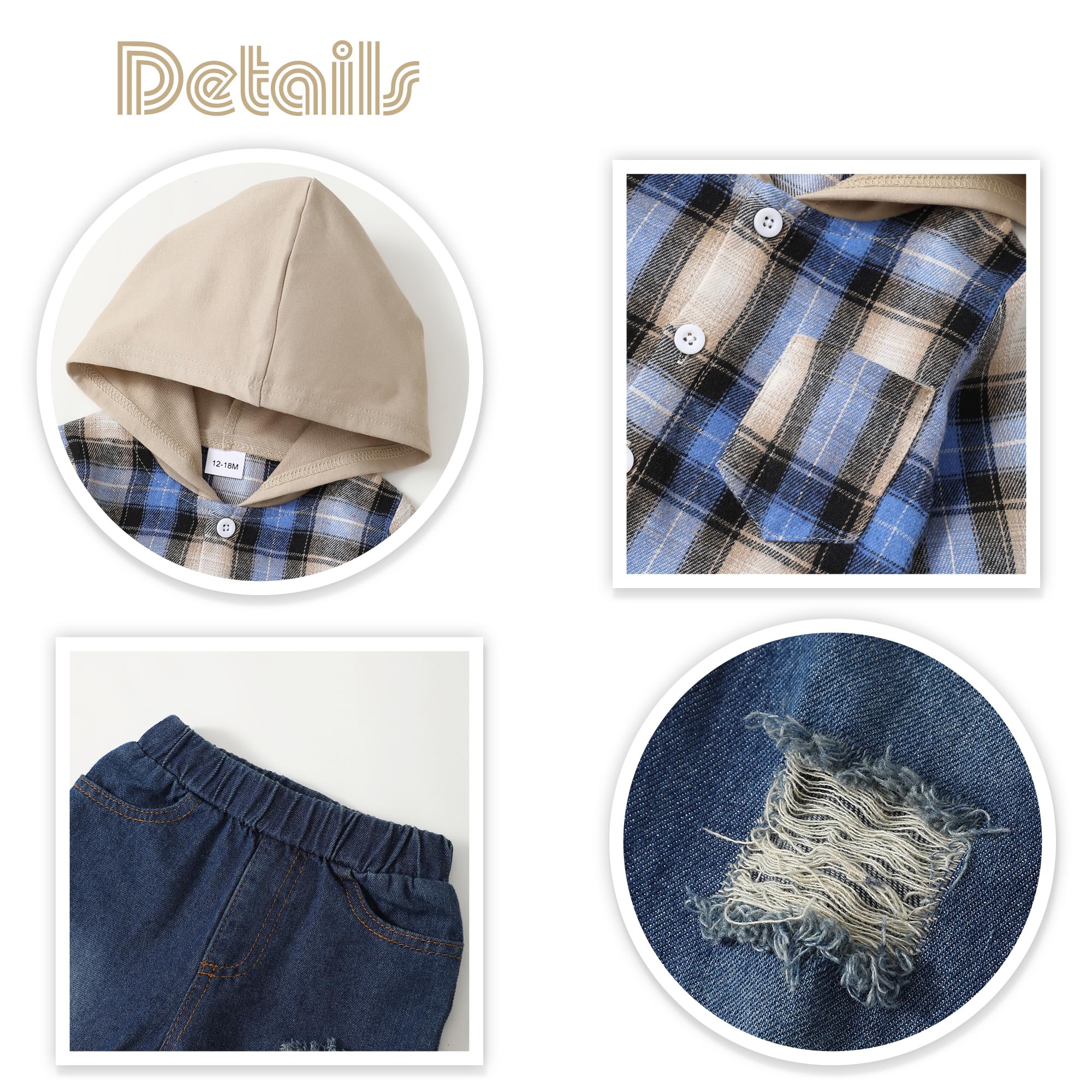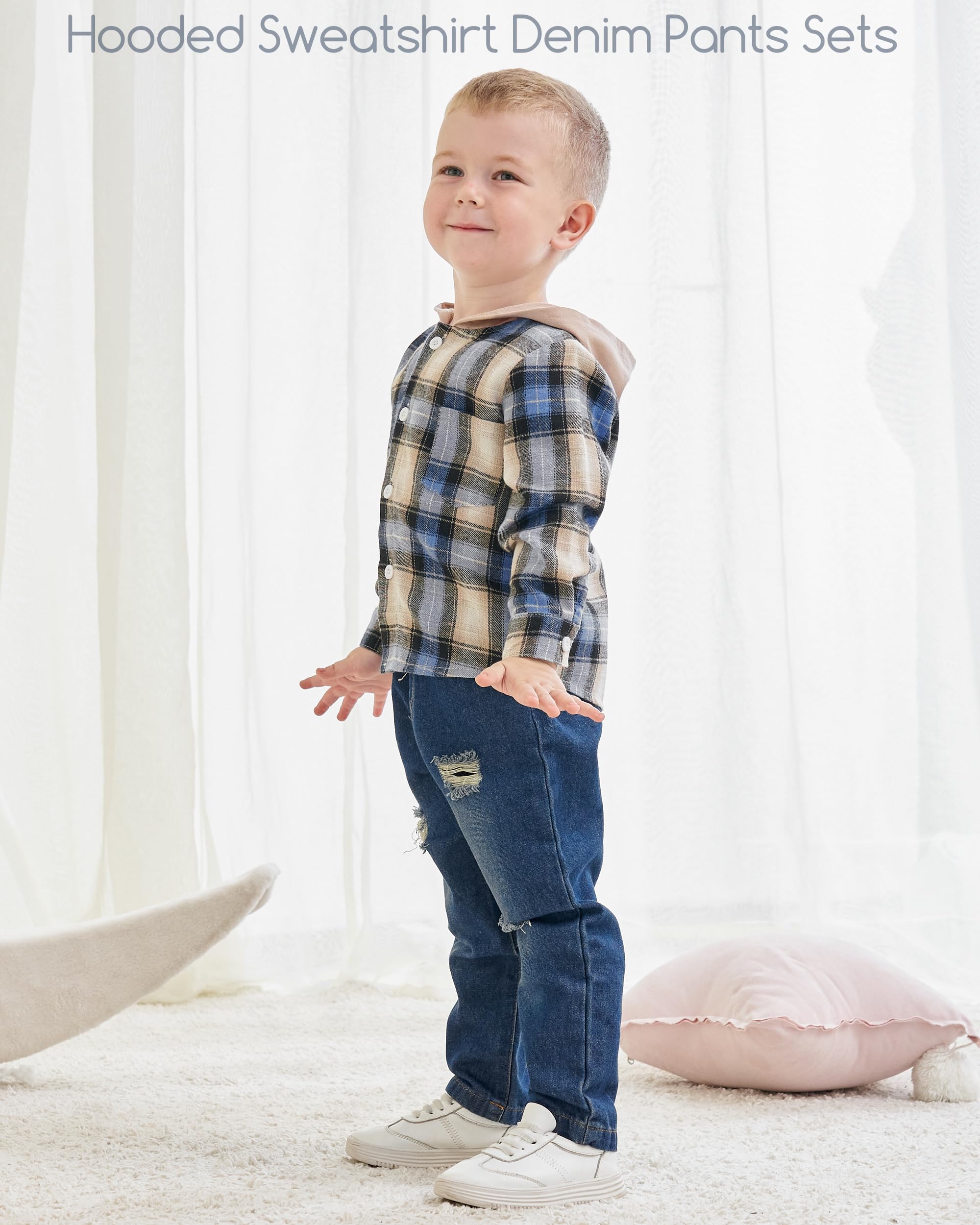 Package: 1 x toddler boy hooded sweatshirt + 1 x ripped denim pants. Hand wash is suggested at the first time. The toddler outfits boy do not fade, no shrinking and pilling after machine or hand wash.