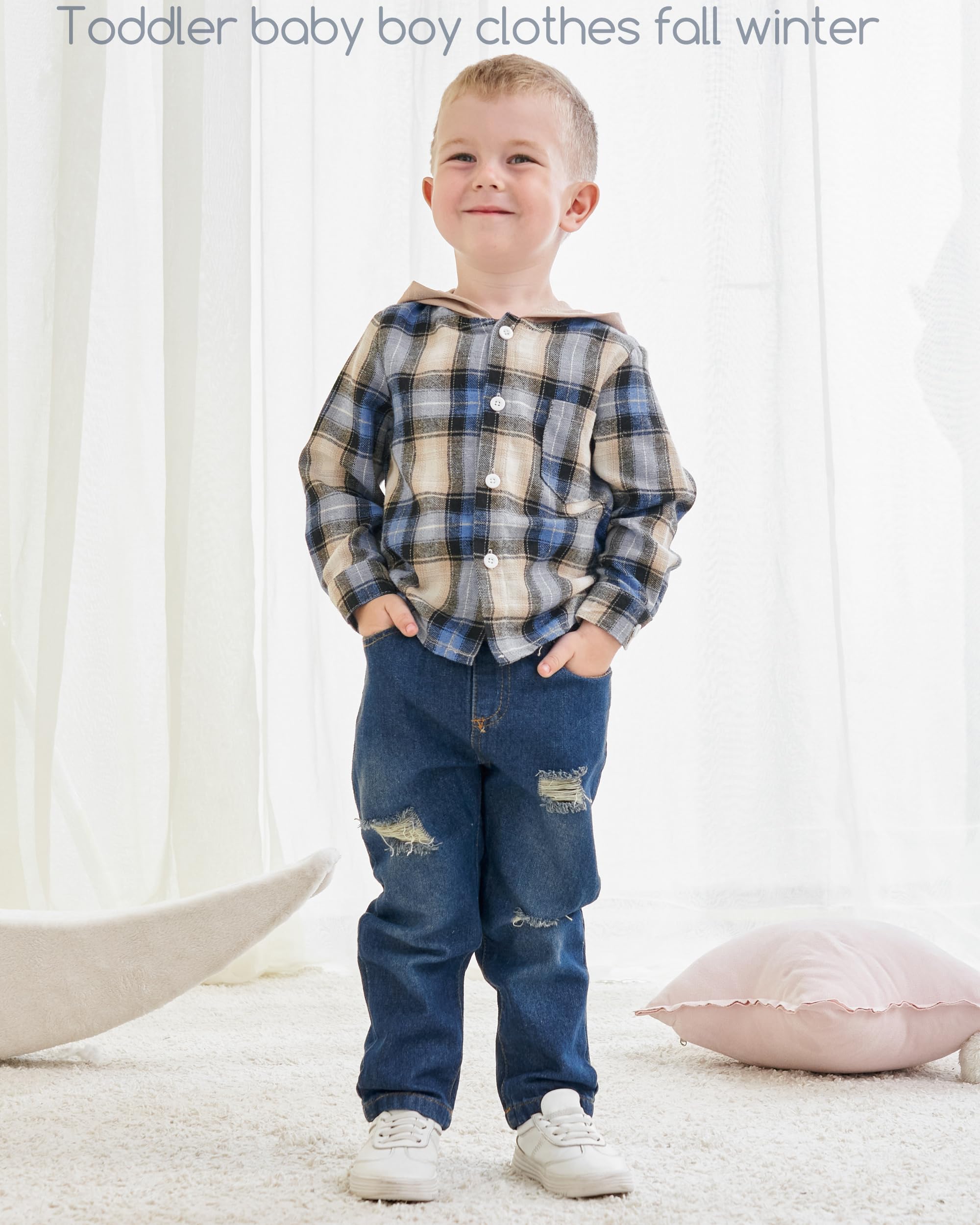 Description Style: 2PCS cute infant boy clothes fall winter Material: Cotton blend, comfy fabric Age: 12 months to 4t, little boy outfits fall Season: Suitable for fall and winter casual wearing