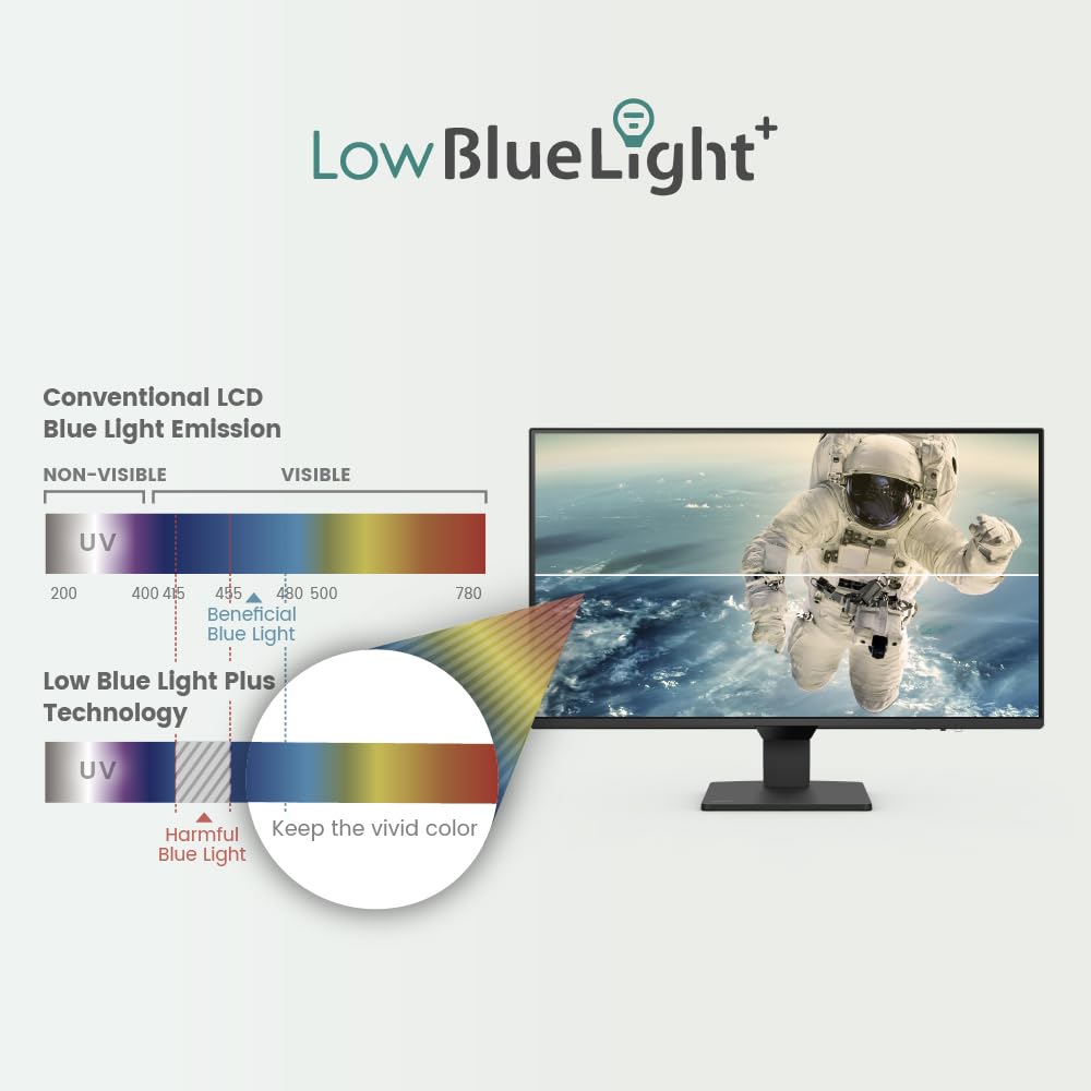 LOW BLUE LIGHT PLUS: filters out the shorter, higher energy blue-violet radiation harmful to the eyes while maintaining vivid color quality