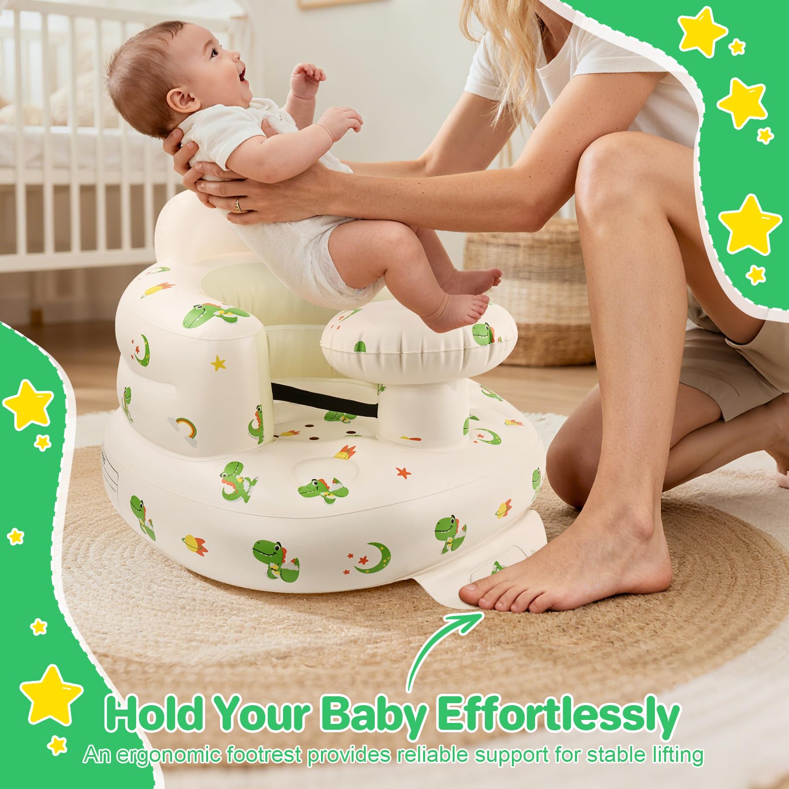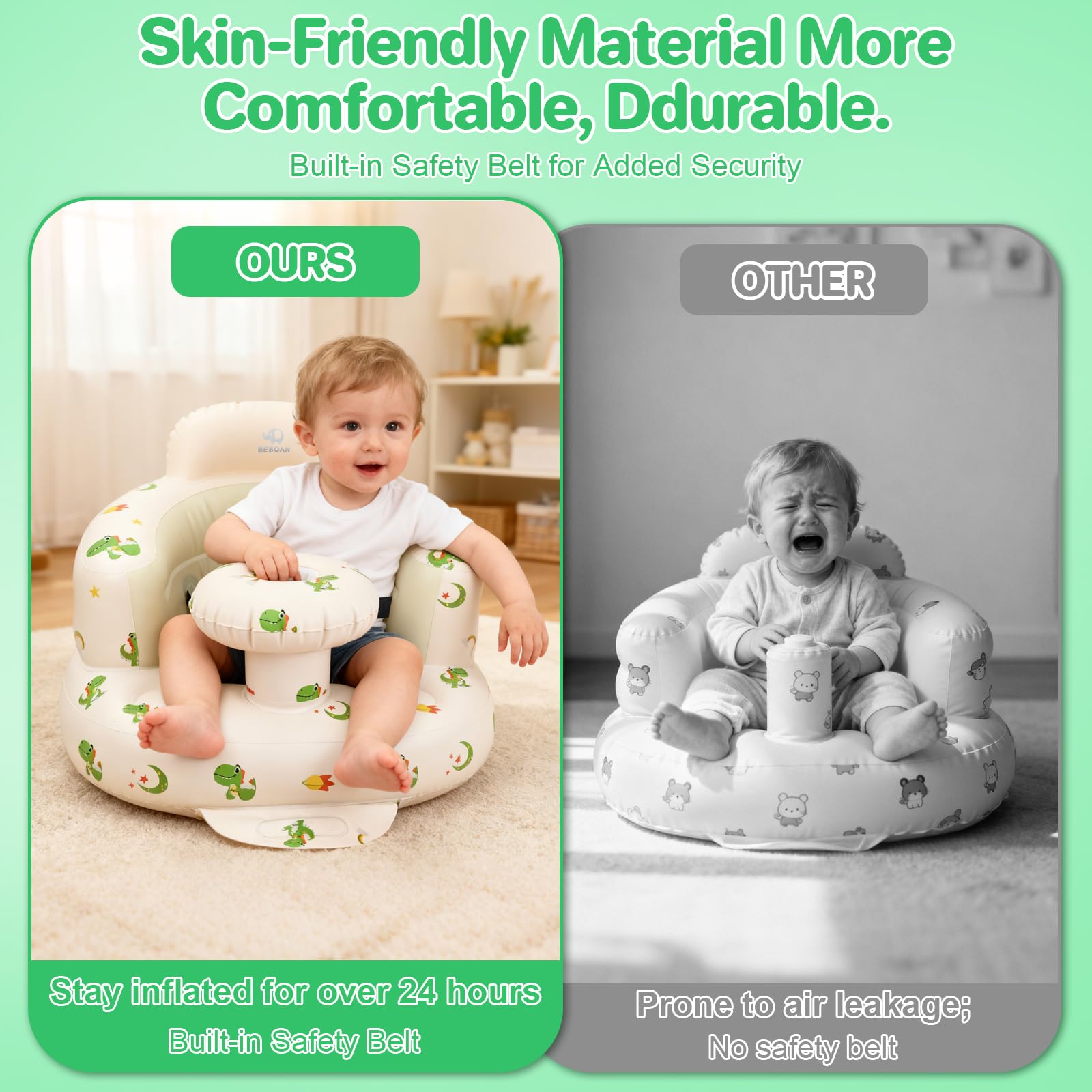 【Safety】: This inflatable baby chair is equipped with a special safety belt to fix the baby's body and ensure its safety and stability during use. Made of high-quality environmentally friendly PVC material, it is soft and skin-friendly to protect the baby's delicate skin.