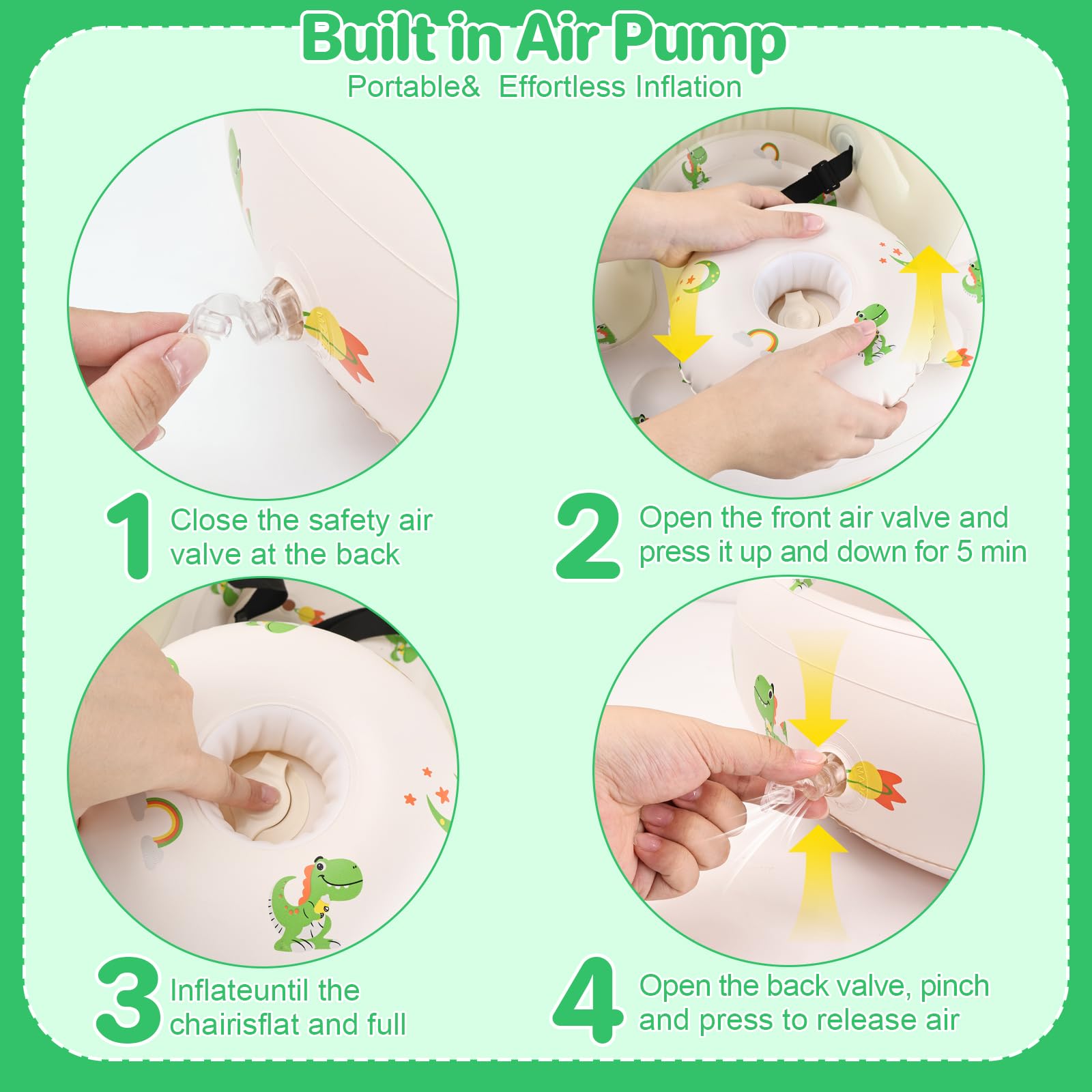 【Easy to Use】: Our inflatable baby seat comes with a built-in air pump. It can be inflated by hand for immediate use, or deflated quickly for easy storage. Suitable for travel and camping