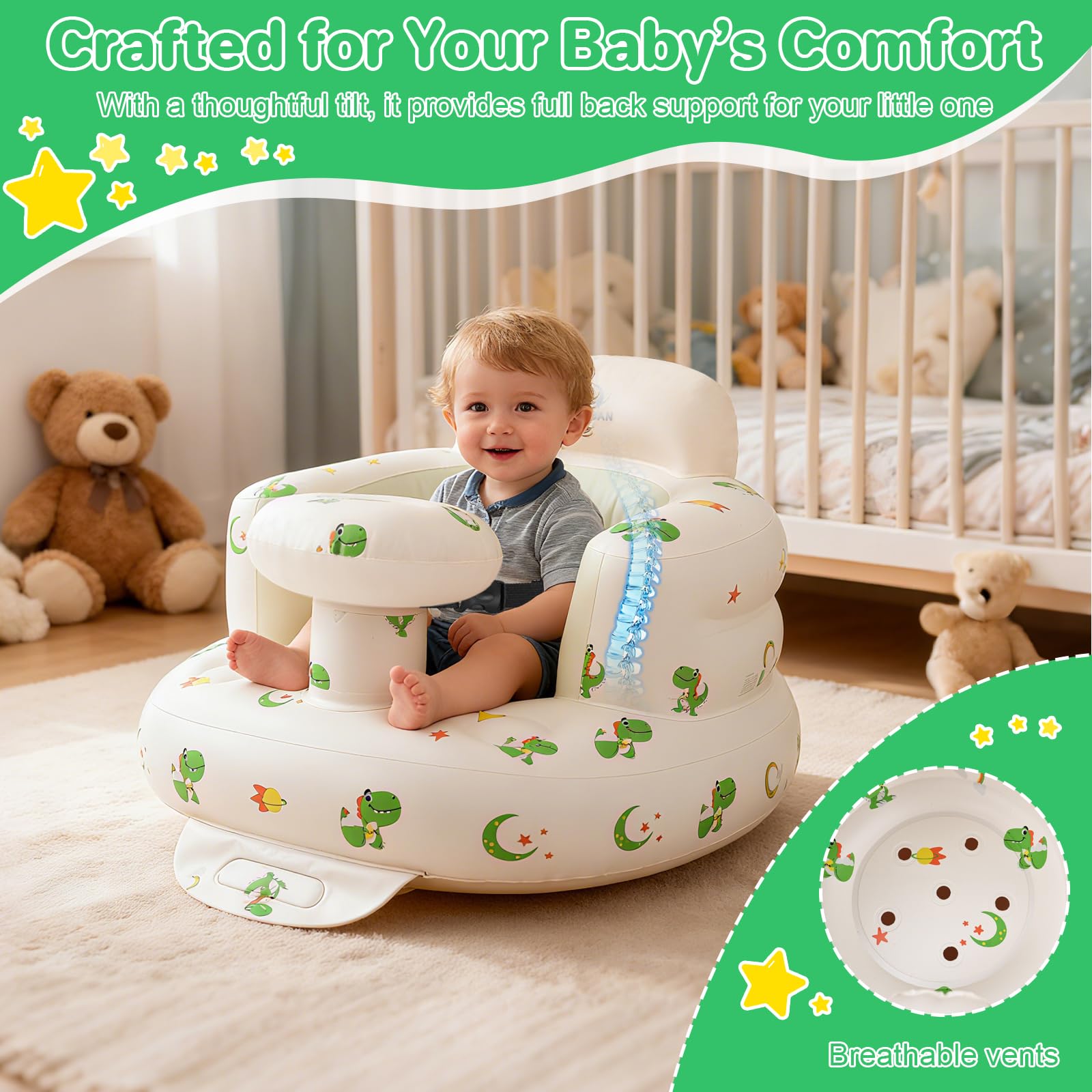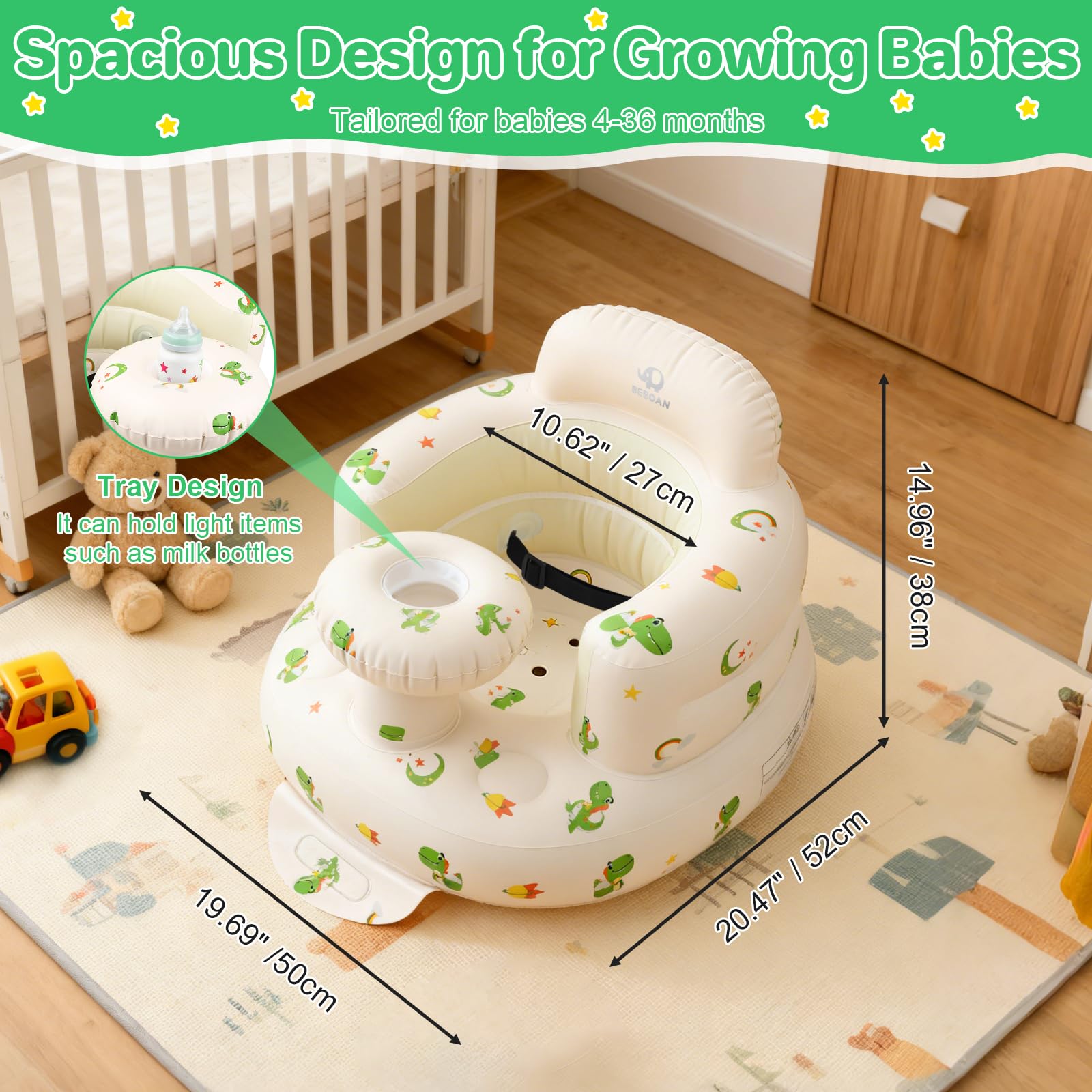【Fun Dinosaur Theme】: The tray keeps toys, snacks, and sippy cups within easy reach, promoting independence. The adorable Green Dinosaur pattern is engaging for baby boys, making sit-up time a more enjoyable and fun experience.