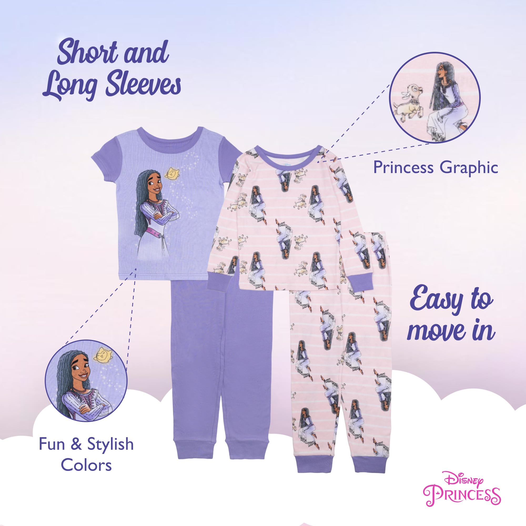 DISNEY PAJAMAS FOR GIRLS: These fun 4-piece pajamas for girls include a short and long sleeve top, and 2 pair of long pants that feature charming graphics and bright colors. They’re available in a variety of sizes to fit your little one.
