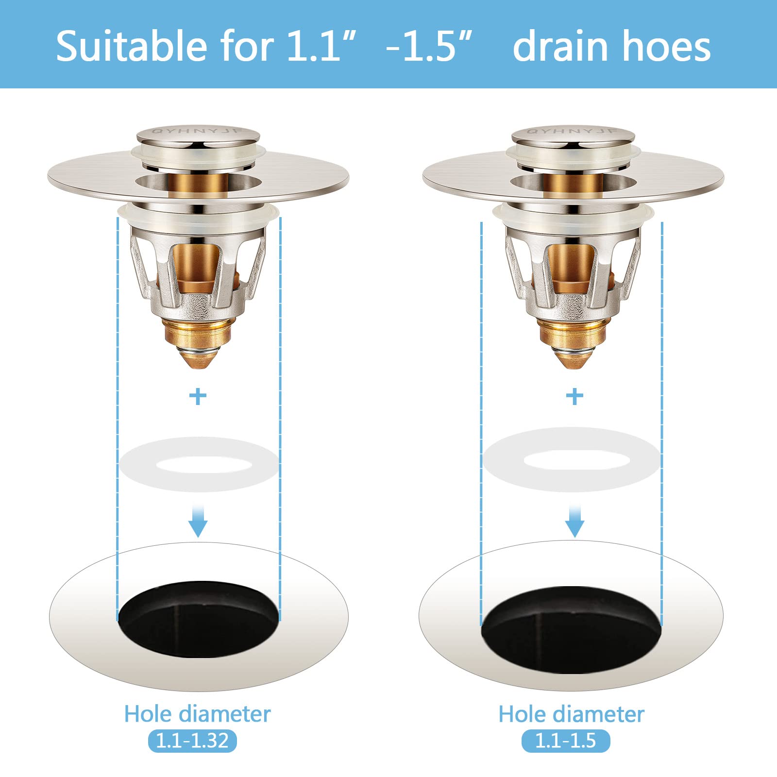 【PERFECT COMPATIBILITY】Bathroom sink stopper nickel brush with a new small diameter (1.1~1.5 inch inner diameter), 2 silicone rings ensure a perfect fit with various drain holes, conforming to most US standards 1 1 /8" ~1 1/2" sink drain holes (depth: about 1.5"),Other similar products are too large for American sinks.