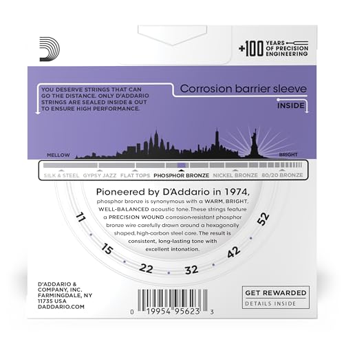 D'Addario was the first to use Phosphor Bronze in acoustic guitar strings back in 1974. Today, Phosphor Bronze is played throughout the world and considered to be the standard in acoustic strings, thanks to its beautiful sonic balance and tonal warmth. Our pioneering Phosphor Bronze acoustic guitar strings are precision wound with phosphor bronze wrap wire over a high-carbon steel core, providing tonal versatility suitable for all acoustic styles and musical genres.