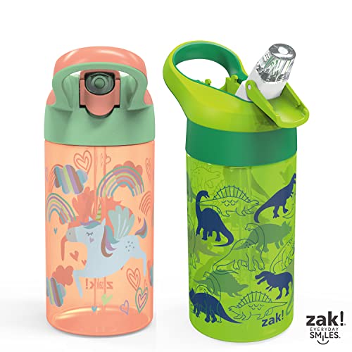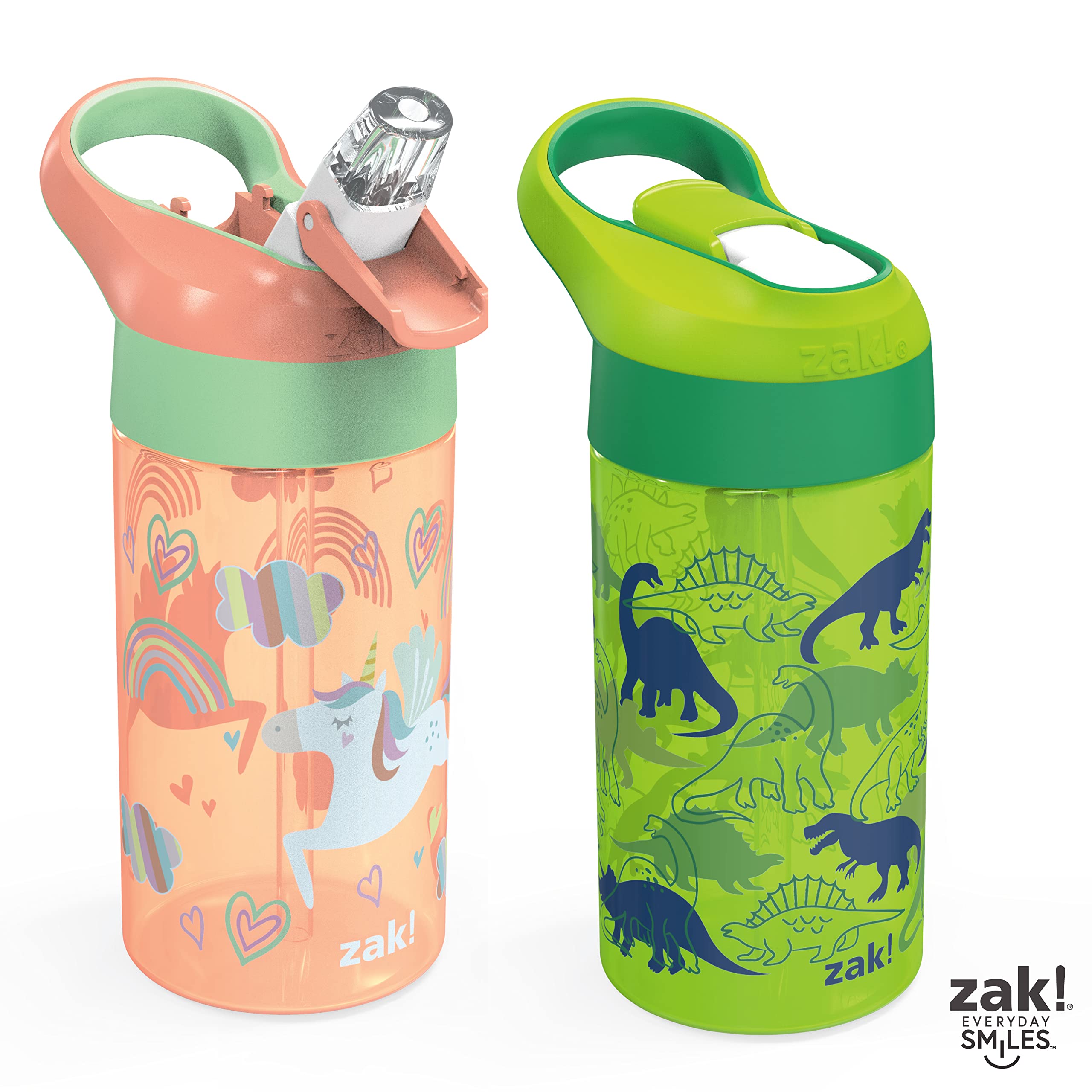 Let kids enjoy hydration with fun water bottles by Zak Designs! Reusable and Durable Material: Reusable water bottles will last wash after wash; good for you and good for the environment! The drinking bottle is made of plastic, which is dishwasher safe and durable enough for kids to use every day. Leak-Proof Lid: The lid screws on securely and won't leak when the spout is closed. A button release to flip up the spout keeps drinks easy to access. On the Go: The water bottle has a built-in carrying loop on the lid for easy transportation and fits in most car cup holders, with a cover to help keep the spout clean. Specifications: Set includes 2 water bottles with different designs. 16 oz capacity. Made of durable plastic. Dishwasher safe, do not microwave. Length: 3.88-inch, Width: 2.83-inch, Height: 7.27-inch. Design: Unicorn and Dino Camo.
