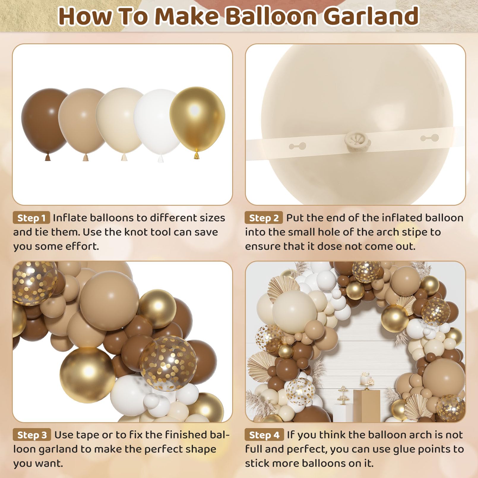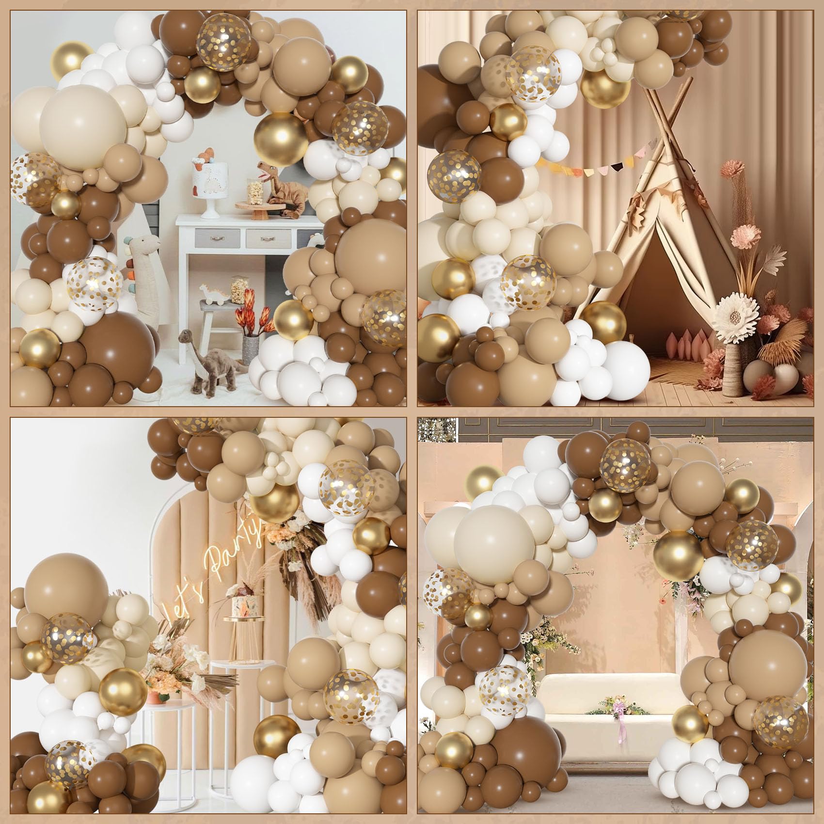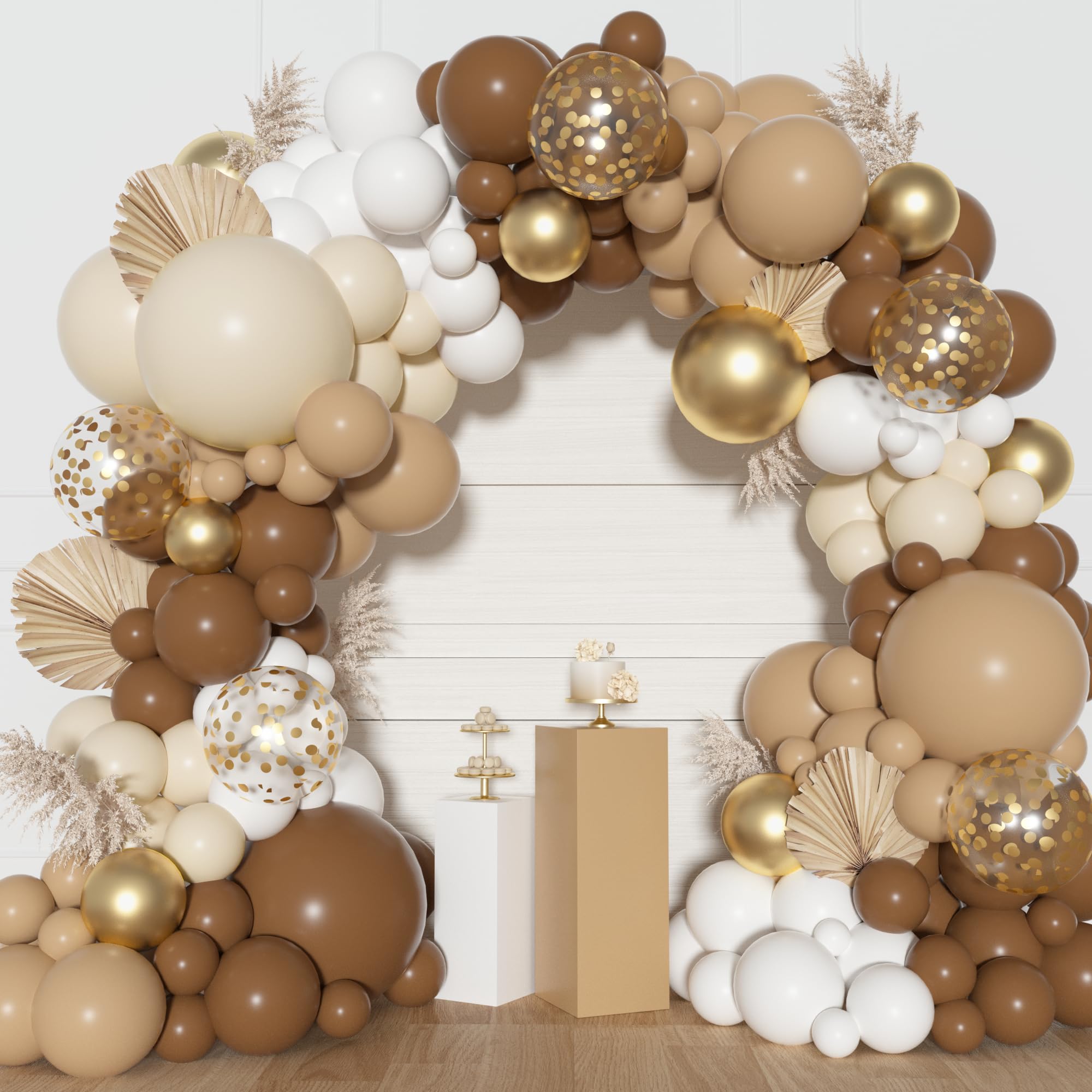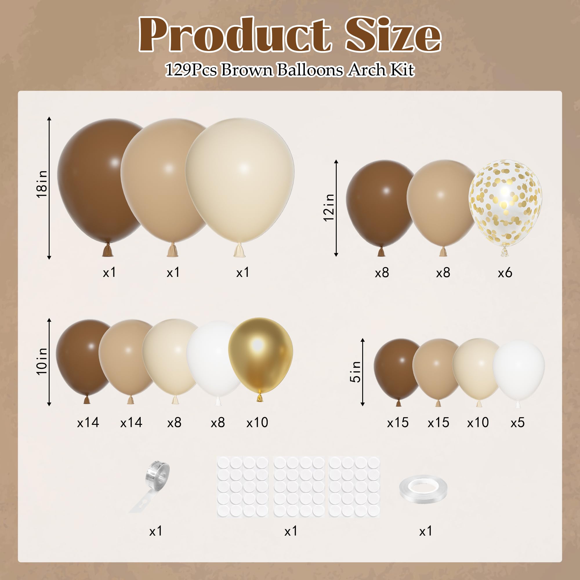 Brown Balloon Garland: Includes 3pcs 18in balloons(brown/nude/sand), 20pcs 12in latex/confetti balloons(brown/nude), 101pcs 10/5in boho balloons(brown/nude/sand/white/gold), 3pcs balloon tools