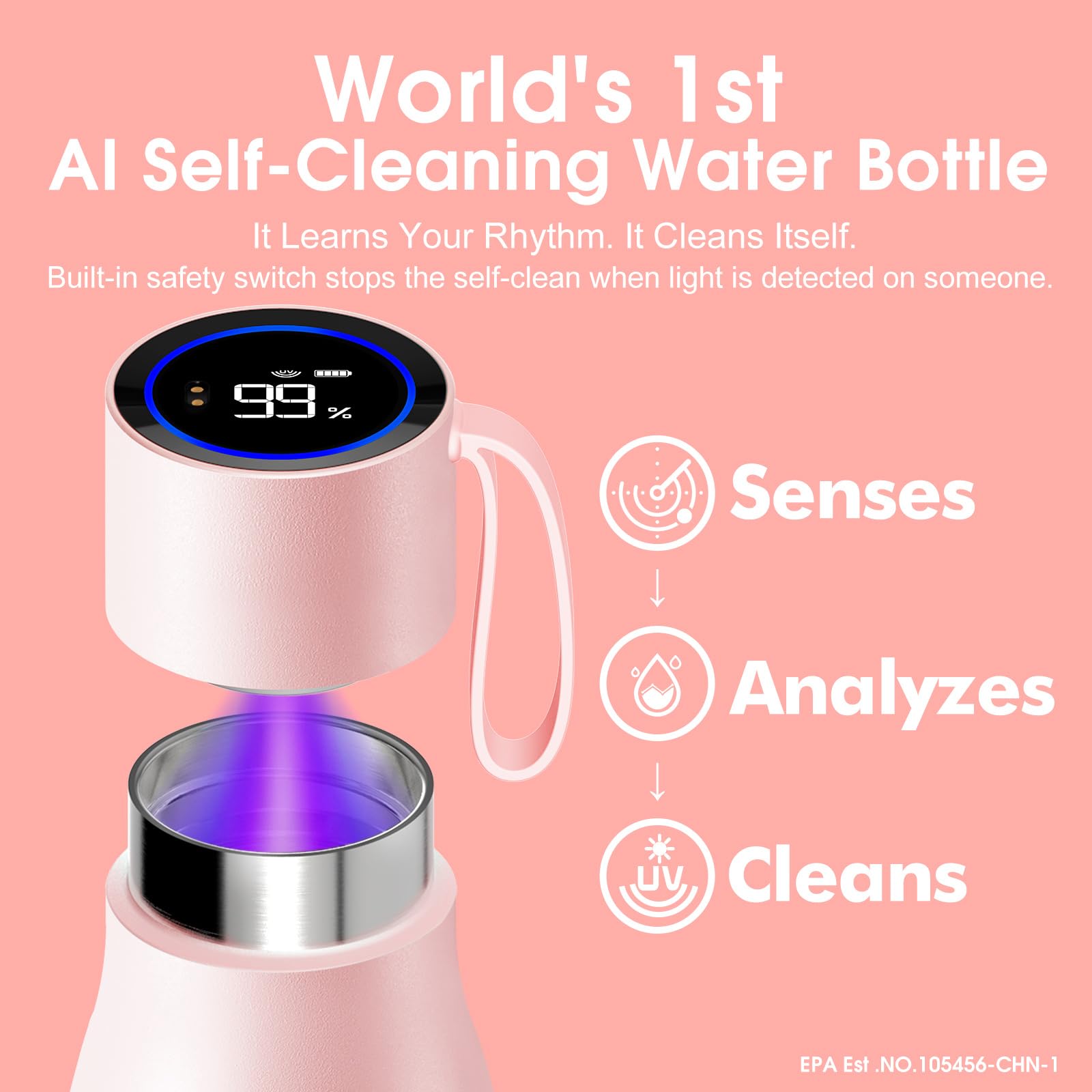 【AI-Powered Self-Cleaning with Safety Lock】This self cleaning water bottle features advanced AI that automatically activates the water bottle self cleaning function based on your usage patterns. The intelligent system includes a safety lock that pauses operation when directed toward the body, ensuring complete protection. With simple long-press activation, it delivers pure water through hands-free sanitization.