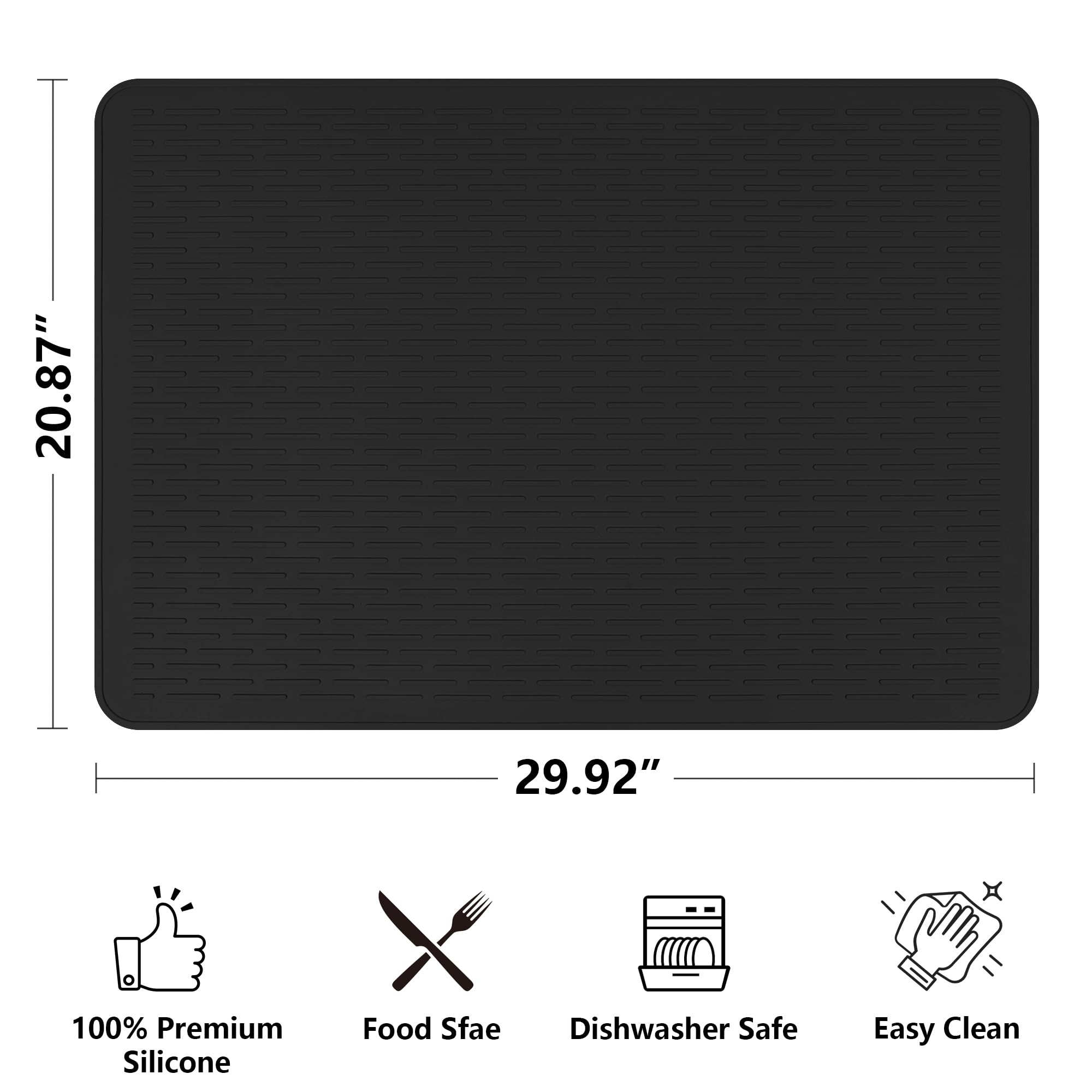 Kitchen Drying Mat:The unique design of wide raised line ridges increases air circulation, improves ventilation, and catches drips from dishes, glasses, fruits, and vegetables. The high edges and waterproof bottom keep the countertop dry and clean, making it an ideal kitchen drying mat.