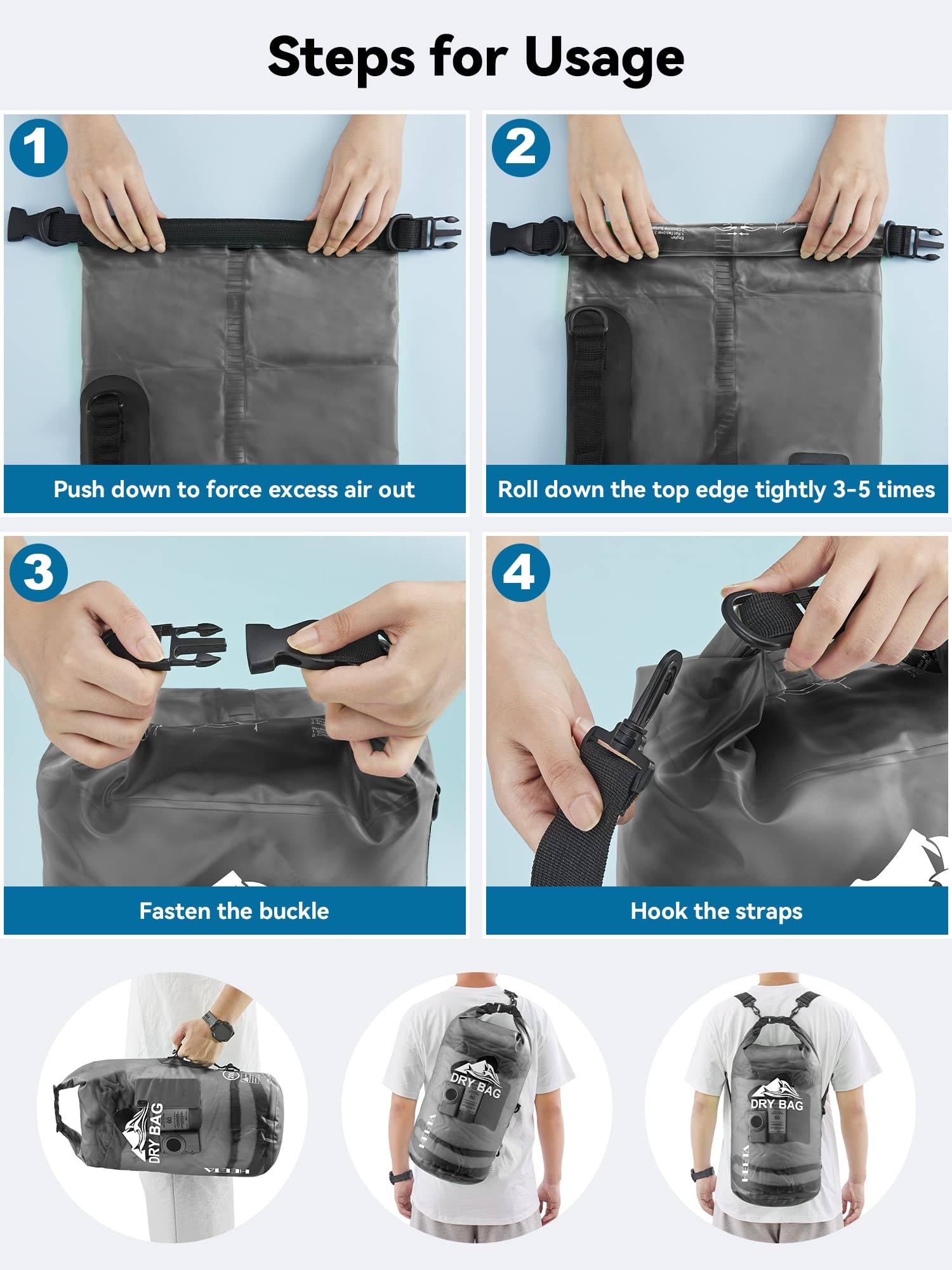 5 Sizes (5L/ 10L/ 20L/ 30L/ 40L) to choose - Great beach vacation and cruise ship essentials, perfect gift for both men and women. Each bag includes a free waterproof, touch-screen compatible phone case, bringing comprehensive waterproof protection to your water sports. Roll the top edge to adjust the bag's capacity
