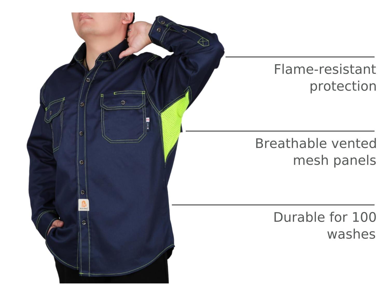 This Men's Flame-Resistant summer work whirt is built for safety and comfort on the job.Designed with breathable Vented mesh panels under the arms and back(button clousure) for better airflow, it keeps you cool during tough tasks in summer hot days.Made from lighgtweight 6.5 oz 100% cotton fabric,Modacrylic/Cotton Blend mesh,it offers reliable flame-resistant protection.The high-visibility yellow contrast mesh and stitching provide added safety in low-light conditions.