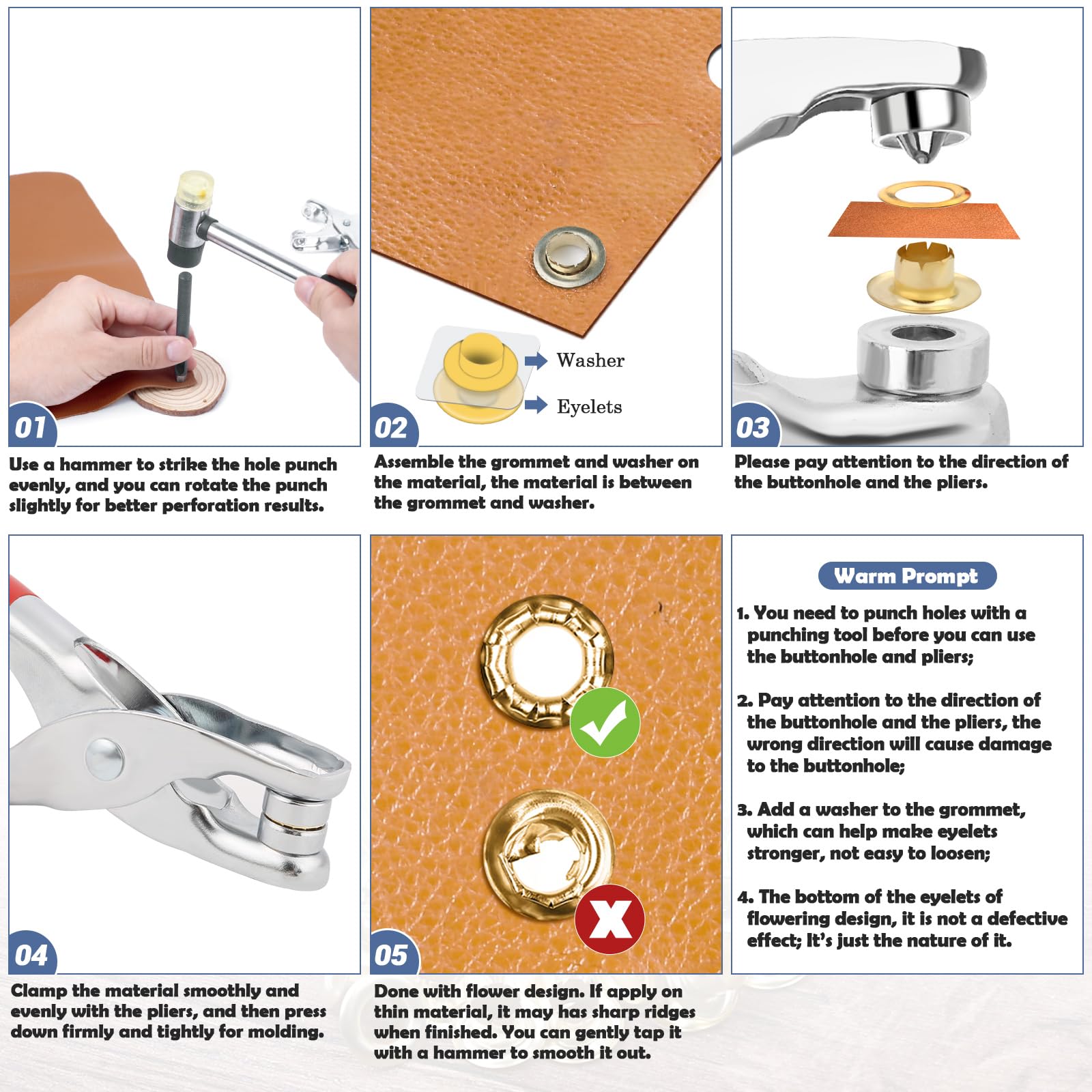 Comes with Use Manual - This eyelets pliers kit comes with a detailed graphic version user manual that can help your DIY works more easily and efficiently. Please pay attention to the direction of the buttonhole and the pliers, the wrong direction will cause damage to the buttonhole
