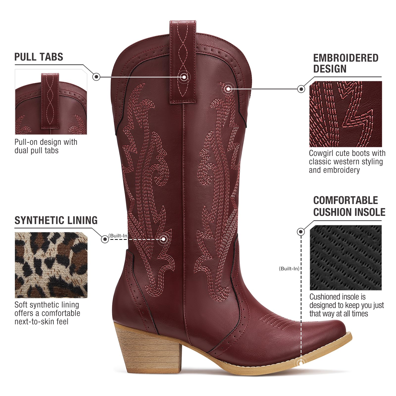All-Day Comfort: Soft synthetic lining wicks away sweat and odor for dry comfort. Low chunky heel prevents feet fatigue during long wear. Cushioned insole cradles arches with silent grip and stable traction. Our cowboy boots deliver cloud-step comfort all day long