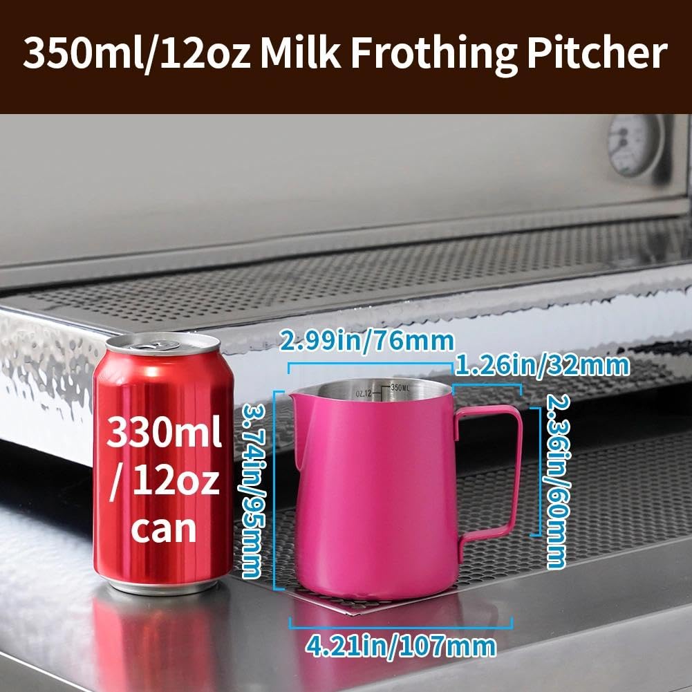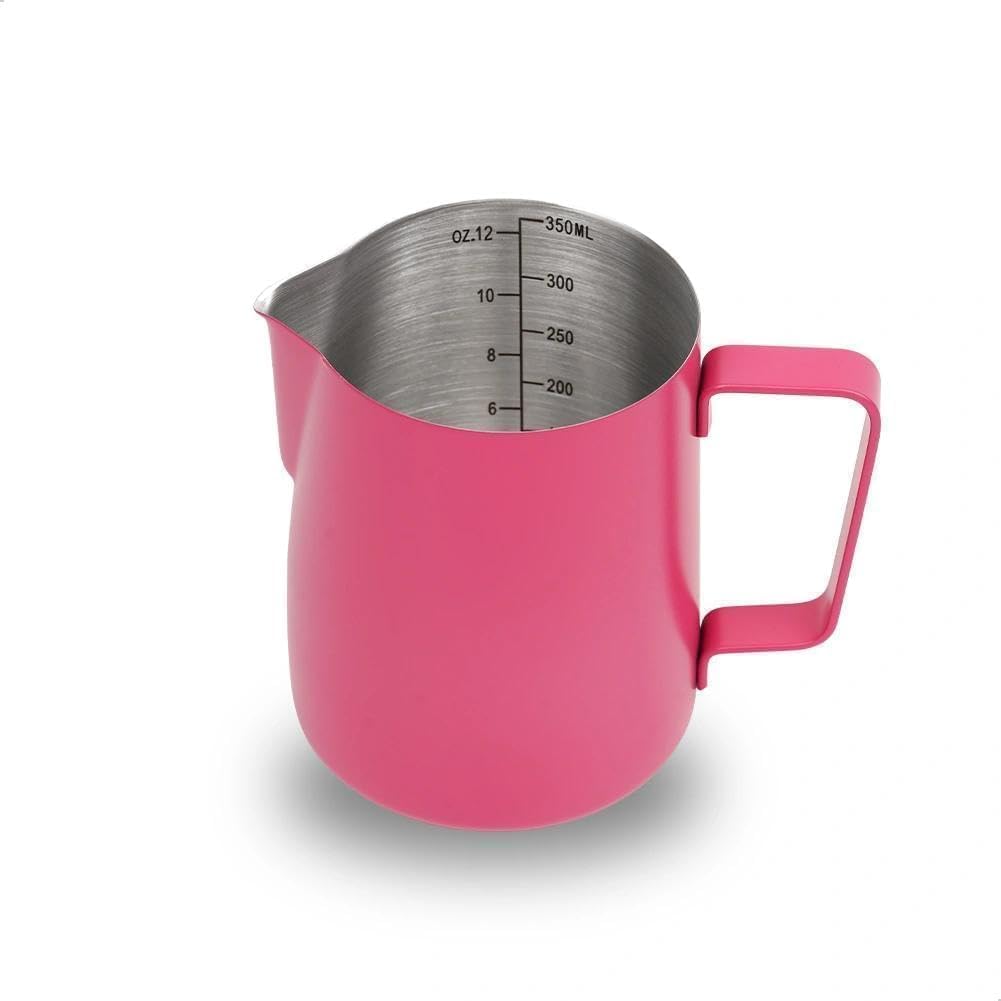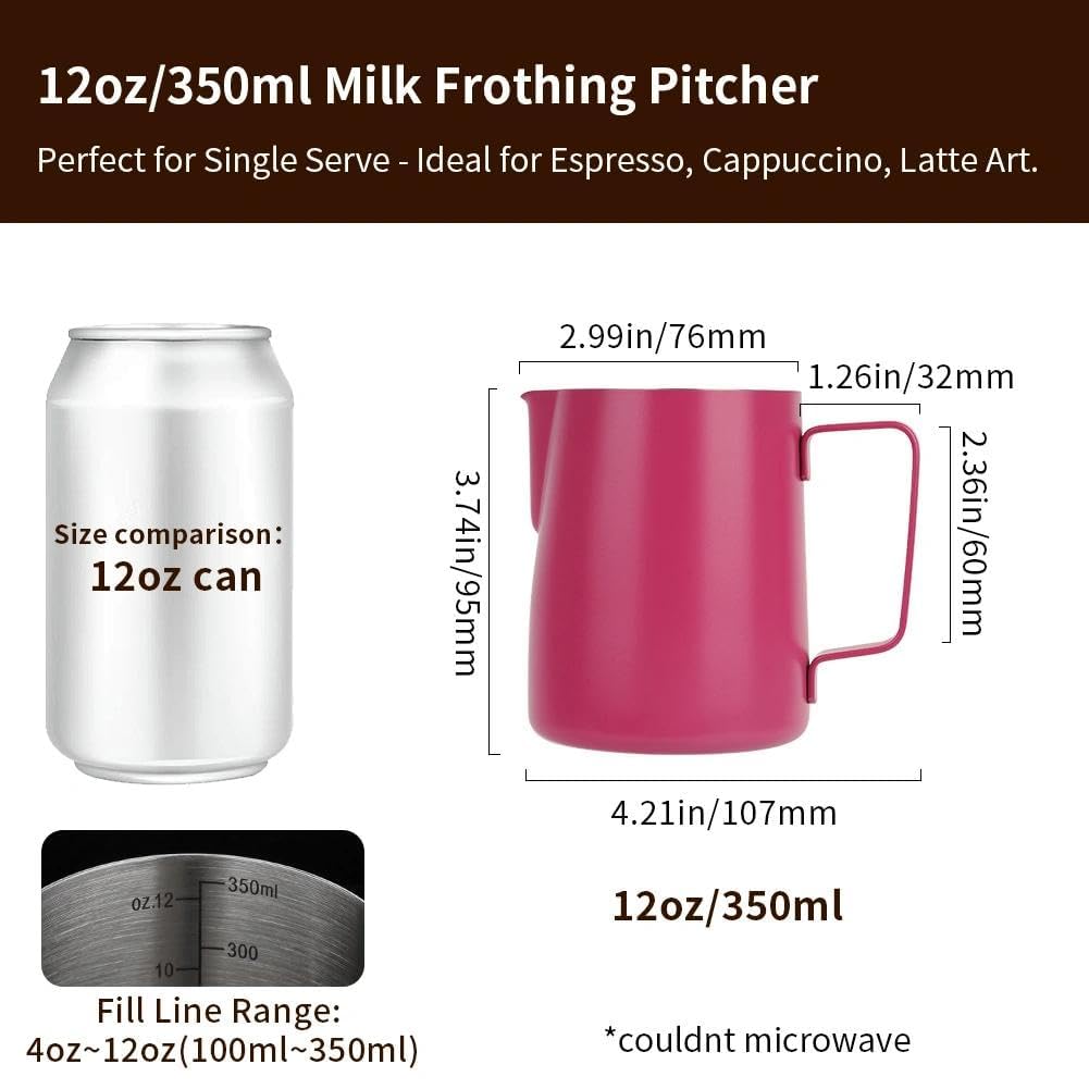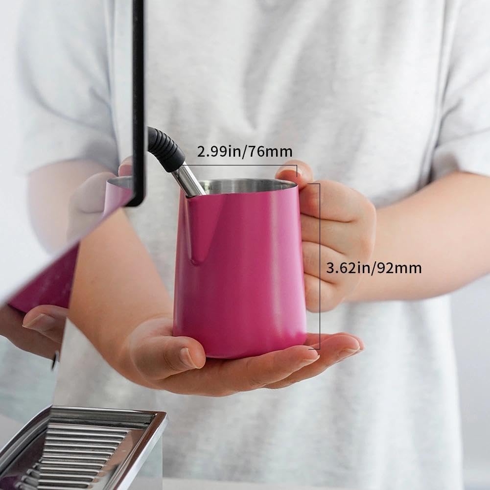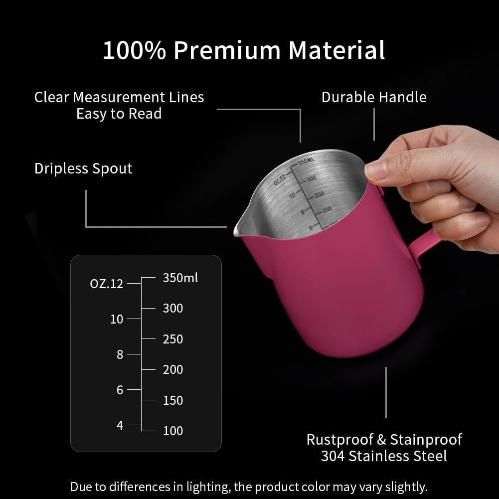 MAKE PERFECT LATTE ART: The milk pitcher ensures that the milk froth is poured slowly and precisely without dripping. Perfect frother cup for making frothing or steaming milk for espresso, cappuccino or hot chocolate. It provides you with a precious control of pouring, easy to create a perfect latte art! Perfect for both professional baristas and novice coffee lovers. PREMIUM MATERIAL: watchget milk frothing pitcher is made of food grade 304 stainless steel with Rose Red coating which is durable and sturdy, wear-resistant and heat resistant. Unbreakable for daily use and can serve you a long time. Easy to clean and use, it offers excellent temperature control. ERGONOMIC HANDLE: The handle provides with a easy grip and precise control of pouring speed and direction, beginner friendly. INSIDE SCALE LINES MEASURING: The milk pitcher has clear inside measurement lines(ml/oz), making it easier to control the amount of milk or cream per cup of coffee. 12/20/32/50oz milk frother pitcher can satisfied your different demands. Ideal for foaming or steaming milk, used in espresso and cappuccinos, it can be used for any liquid measuring like water, juices, batter mixes, smoothies etc. DRIPLESS SPOUT DESIGN: The dripless spout allows you pour milk foam smoothly and precisely without dripping. You can practice and create your own beautiful latte artwork easily! Please note that the volume indicated in the milk pitcher is only the maximum capacity, not the optimal capacity. Due to the need for frothing and other steps, it is not advisable to fill the pitcher too full.