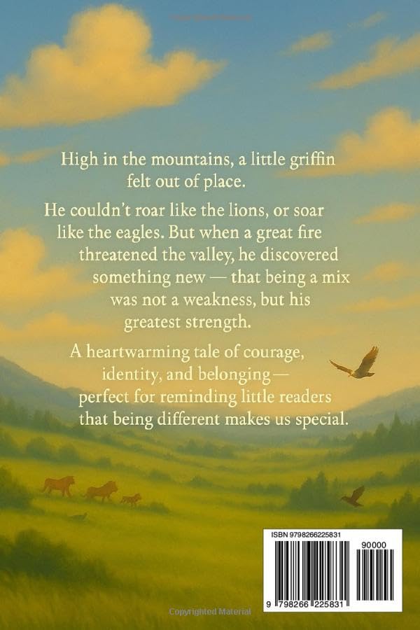 A heartwarming rhyming story about courage, belonging, self acceptance and finding your place. High in the mountains, a little griffin feels out of place. He cannot roar like the lions. He cannot soar like the eagles. But when danger threatens the valley, he discovers that being different is not a weakness — it’s his greatest strength. The Griffin Who Belonged is a heartwarming picture book about courage, identity, and discovering your place in the world. With lyrical rhymes and stunning illustrations, this gentle story shows children that being a mix of two things makes you unique — and that true belonging comes from being yourself. Perfect for bedtime reading or classroom story time, this uplifting tale is ideal for children ages 3–7 who are learning about courage, kindness, and self-acceptance.