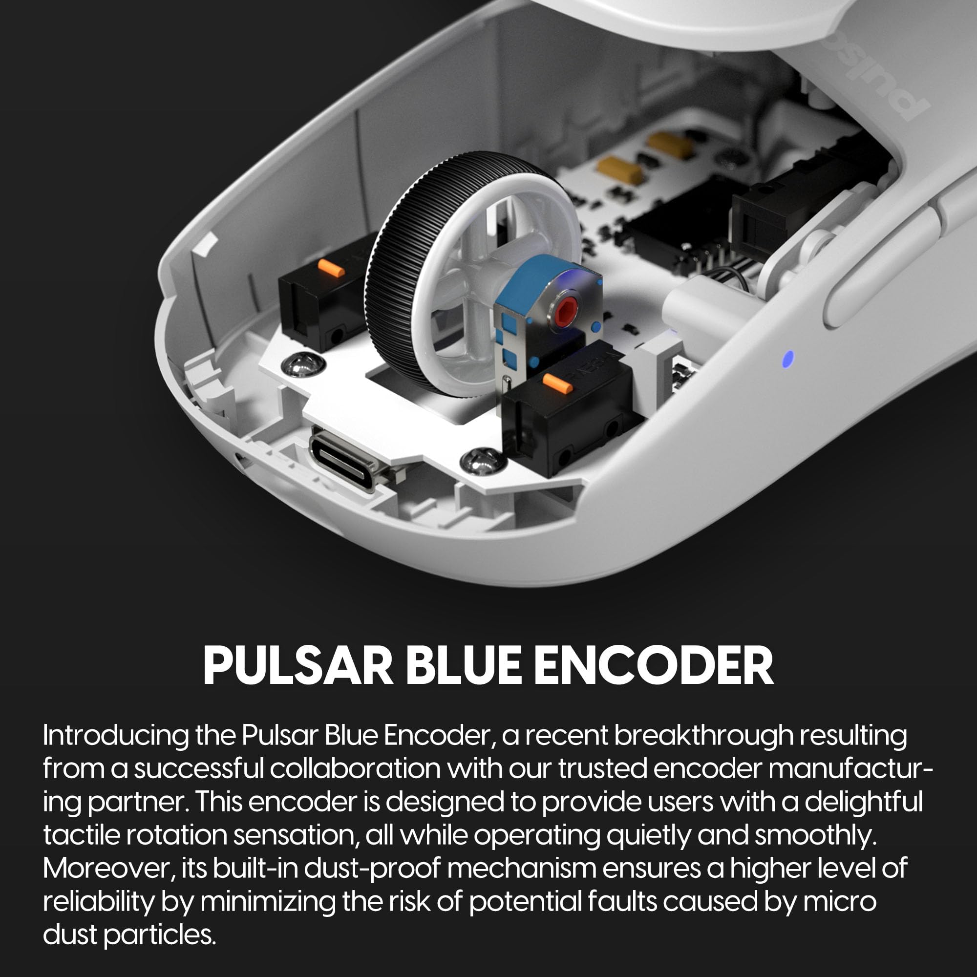 Speed of Light Optical Switches - Minimizing the chances of unintended double clicks, these switches ensure swift and pinpoint responses. Paired with the Pulsar Blue Encoder, which offers a delightful tactile rotation experience, all within a dust-proof structure.