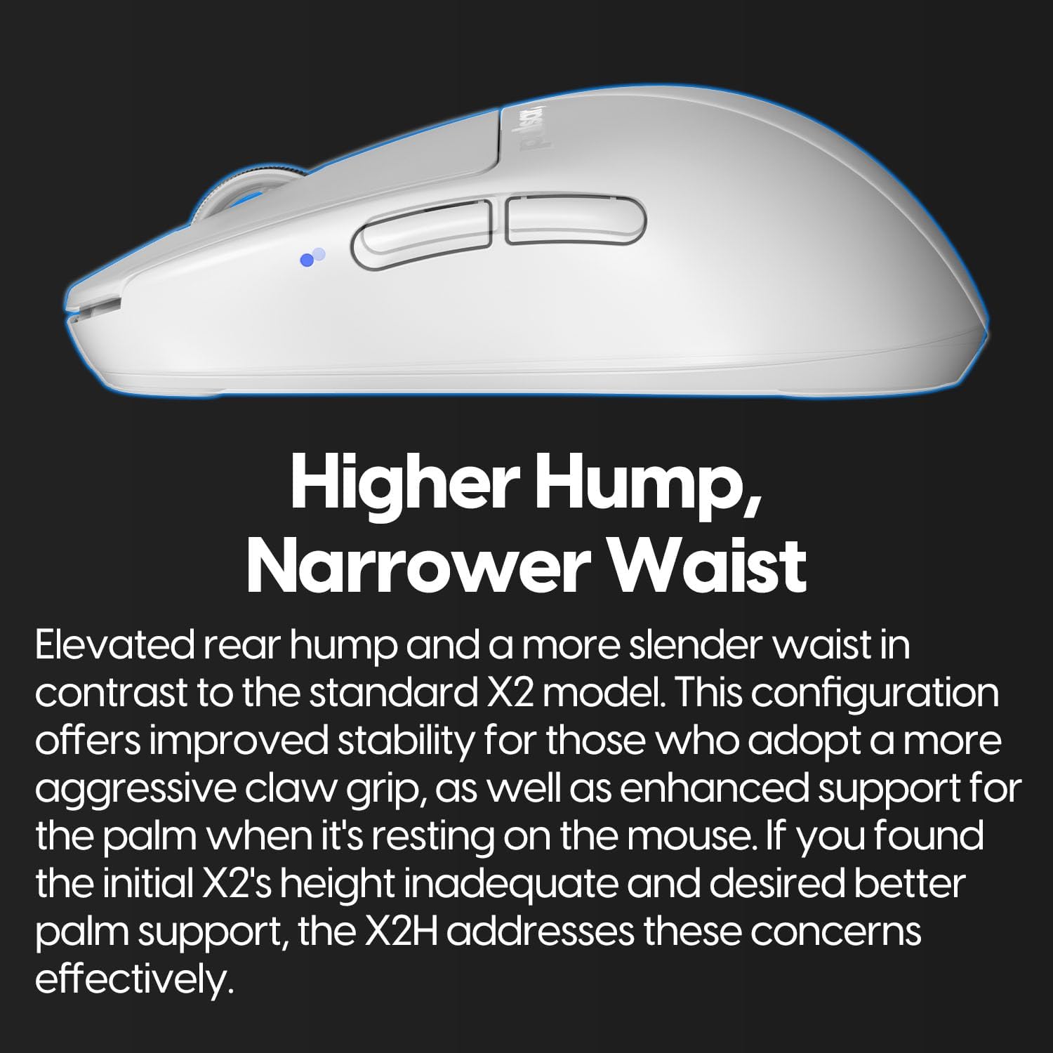 Higher Hump Narrower Waist - Elevated rear hump and a more slender waist in contrast to the standard X2 model. Offers improved stability for those who adopt a more aggressive claw grip, as well as enhanced support for the palm when it's resting on the mouse.