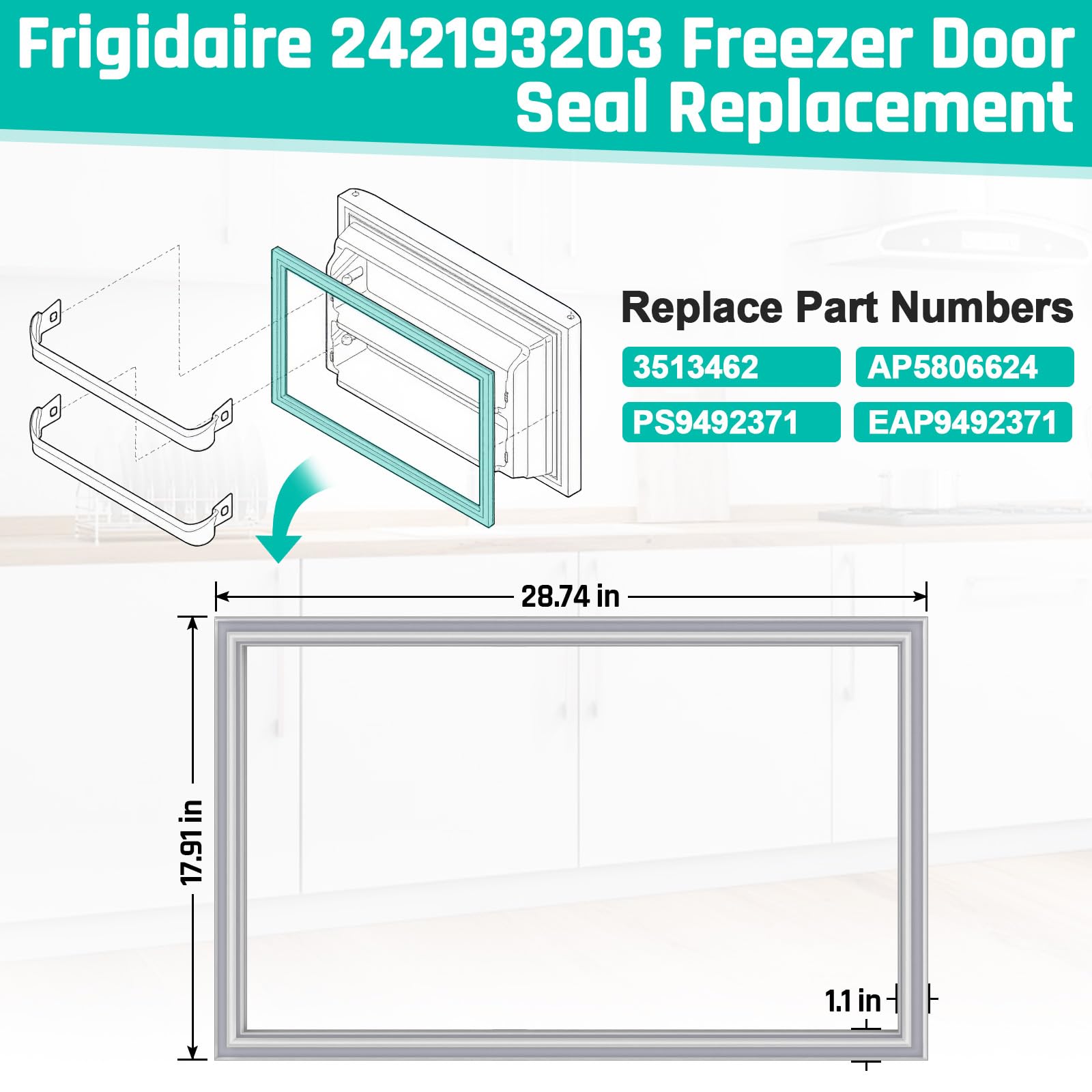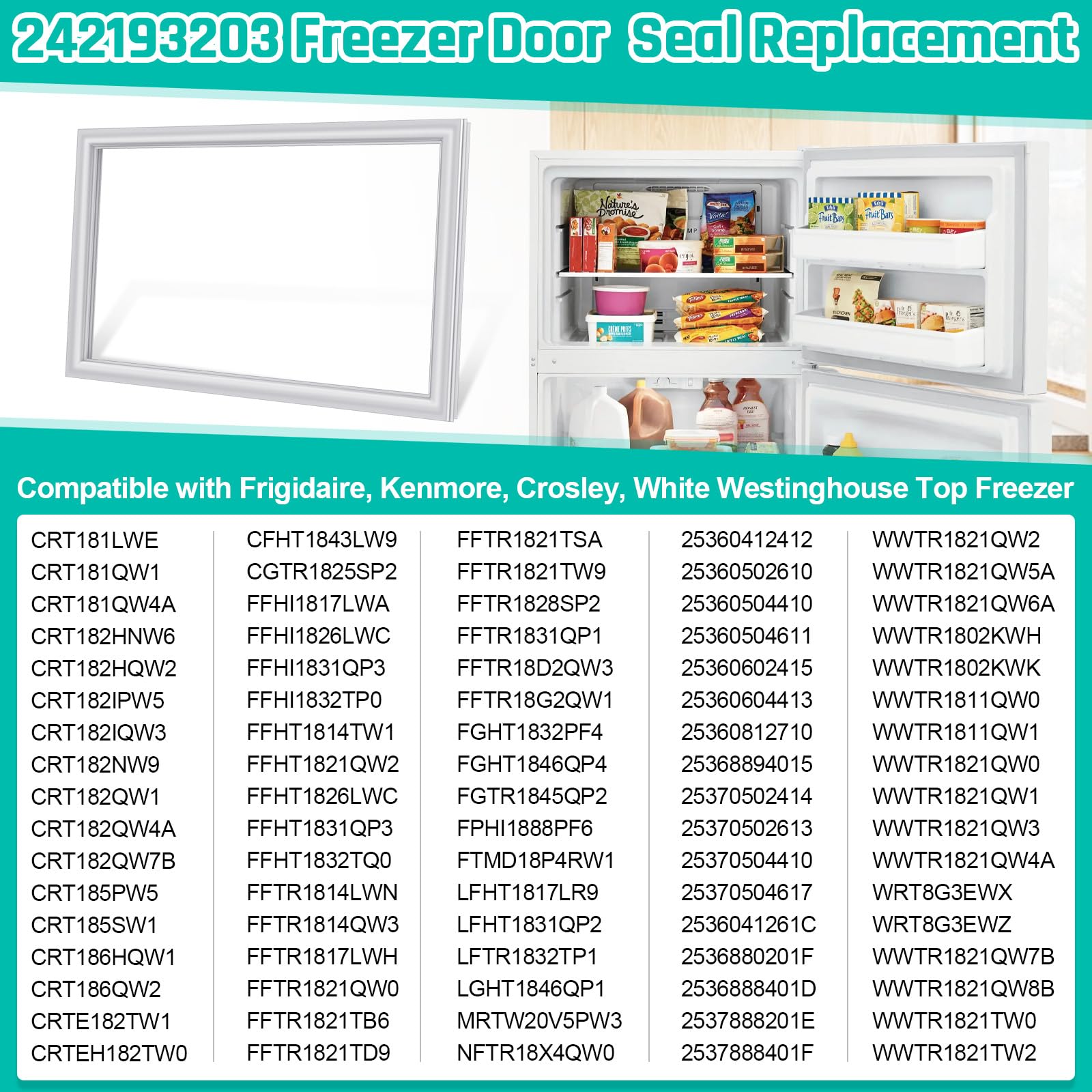 [F242193203 Freezer Door Gaske Replace Part Numbers] 242193203 fri-gidaire freezer door gasket can replace these part numbers: 3513462, AP5806624, PS9492371, EAP9492371. More compatibility, please check our product page. If your model or part number is not found or you are not sure whether your model is suitable, please contact us to check it for you. NOTE: Refrigerator gasket replacement model is generally on the front and back of the refrigerator, in the refrigerator room