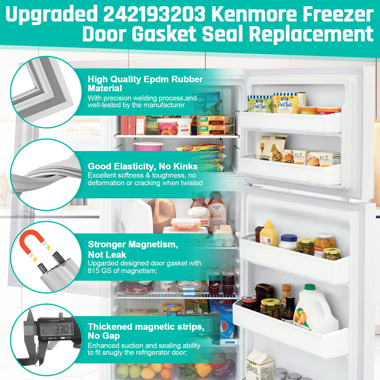 [242193203 Repair Symptoms] Durability ken-more refrigerator freezer gasket 242193203 can perfect solve following problems: ➊Door gasket broken torn, worn ➋ Moldy & dirty door gasket ➌Leaking / poor seal, temperature not staying cold. ➍Condensation builds up/ frost / ice build up inside. The inside of the magnetic stripe adopts advanced "strong magnetic sealing" technology, and the it is made of external environmentally friendly and non-toxic materials effectively extend the life of the refrigerator.