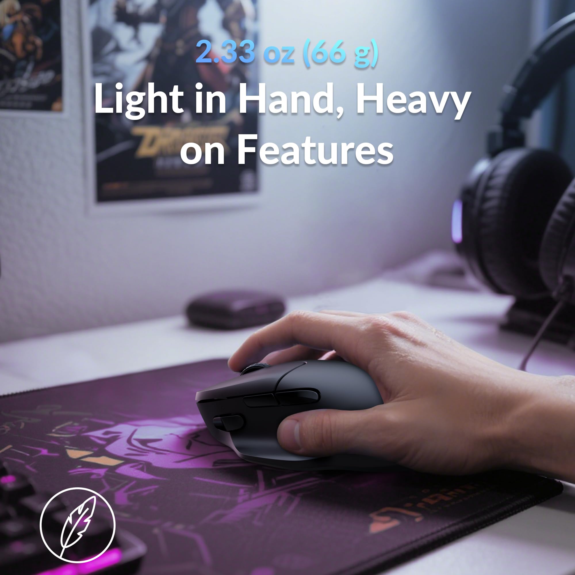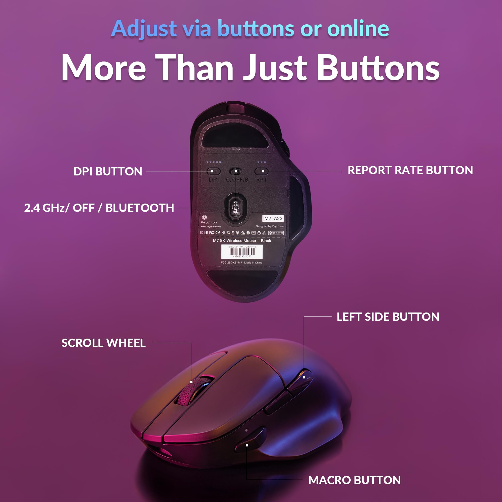 Wireless Mouse - Weighing just 0.146 lb (66g) and equipped with a PAW 3950 sensor, the Keychron M7 8K delivers top-tier performance in an ultra-lightweight build. Perfect for work, gaming, or travel with dual wireless 2.4 GHz and Bluetooth connectivity. *Processor requirement on 8K polling rate: Intel i7 9th Gen, AMD Ryzen 7 2nd Gen or above