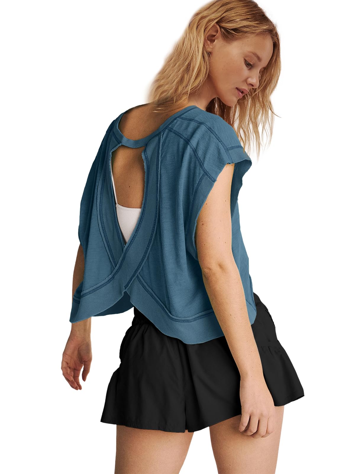 Fit: Please order your regular US size. The workout tshirts for women is an oversized style that not only flatters your figure but also pairs effortlessly with any outfit. If you want a more comfy loose fit for this womens open back tops, suggest ordering one size larger.