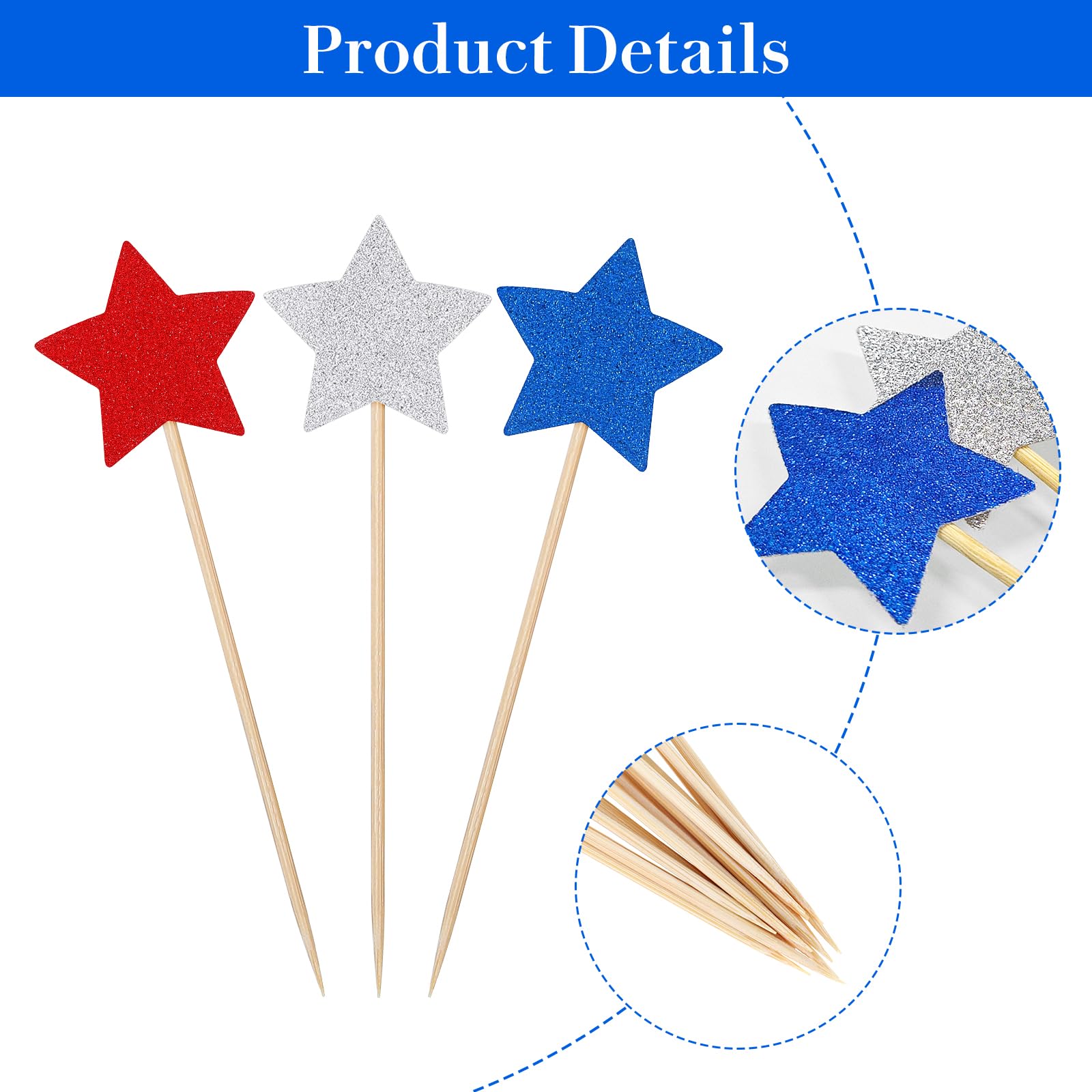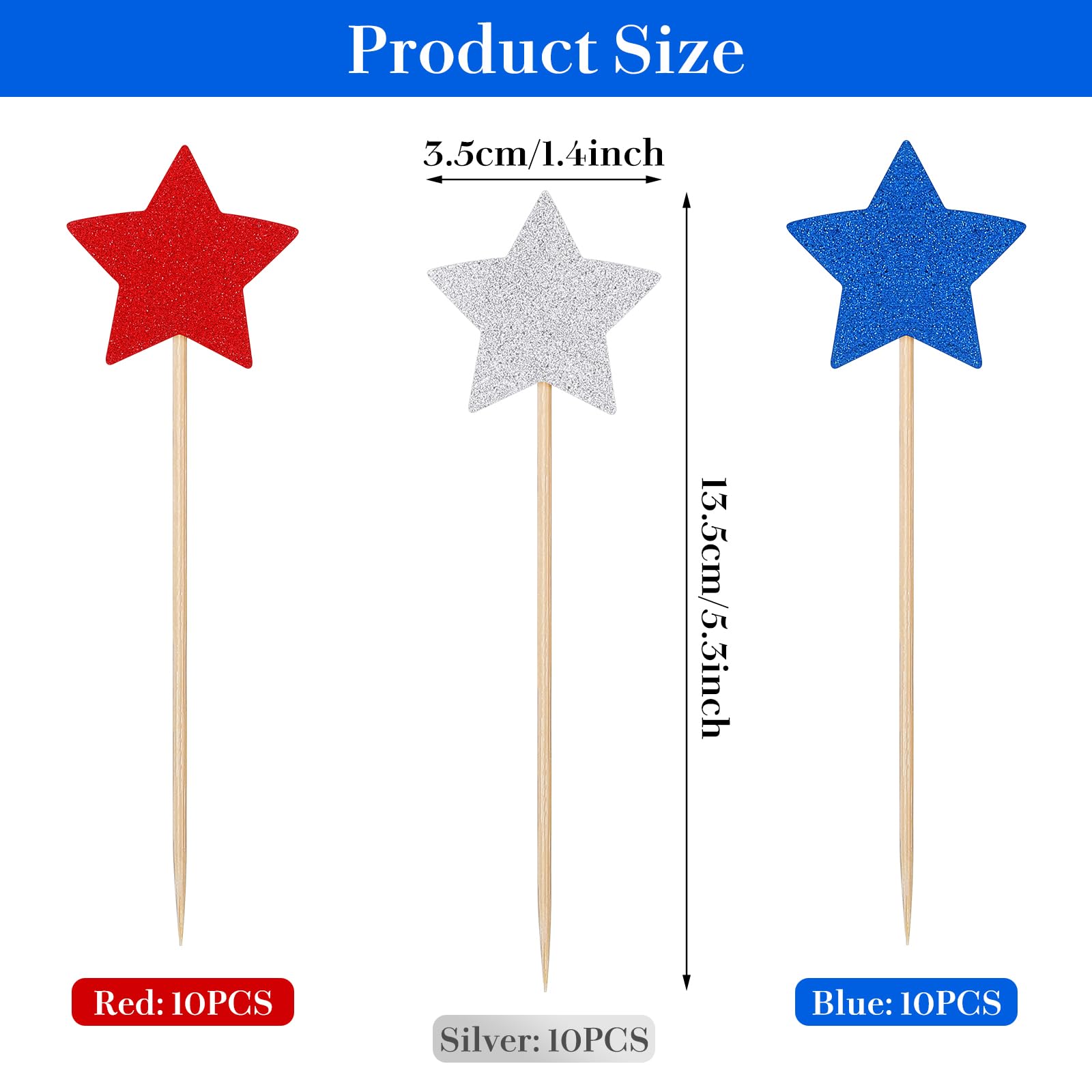 Product name: 30pcs star cake inserts Color: red, blue, silver Material: wood, paper Product size: 13.5*3.5cm Gross weight: 16.2g Packing list: 30pcs star cake inserts, red, blue, silver (10 pieces per color)