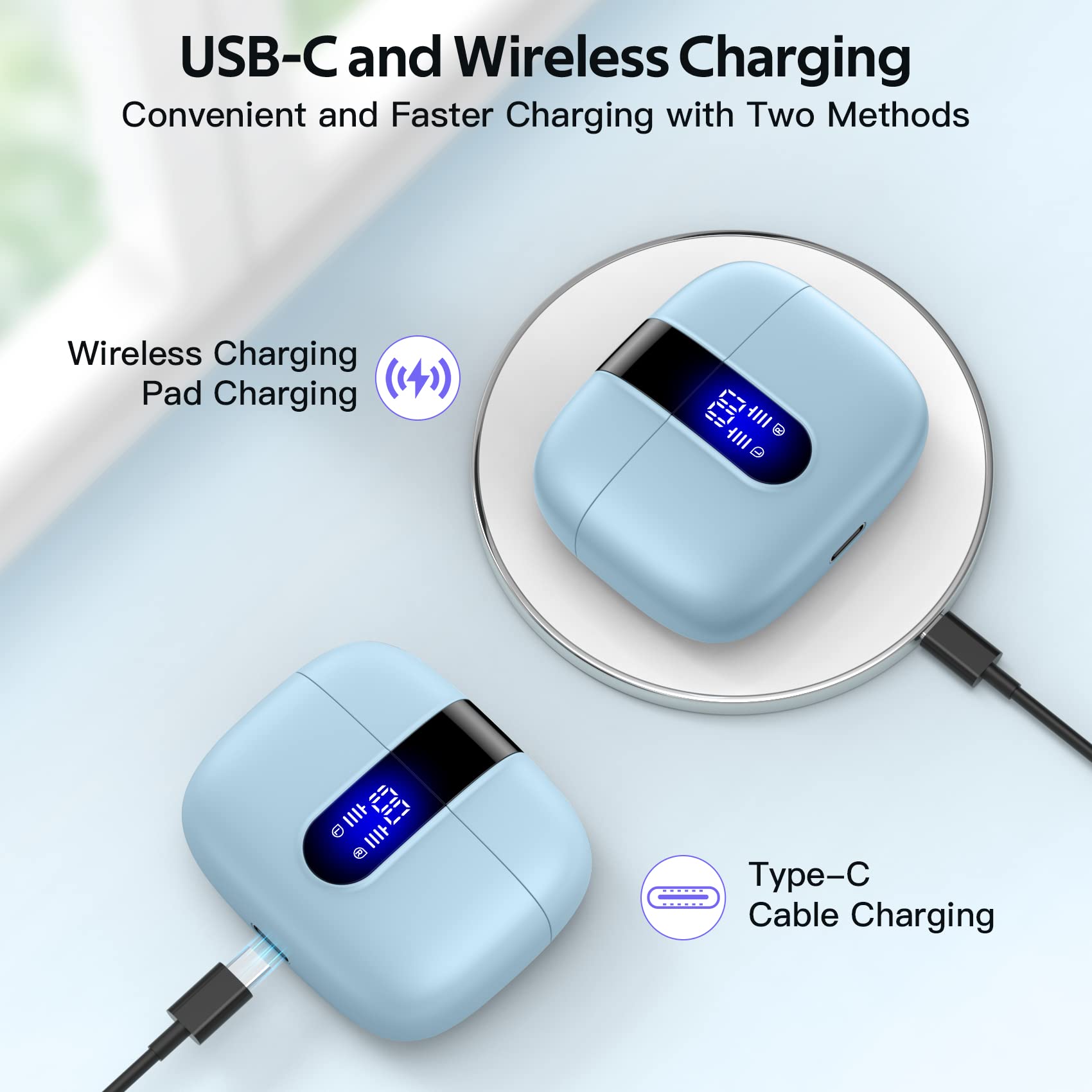 Wireless Charging and IPX5 Waterproof: The charging case of these bluetooth earbuds support wireless charging and USB C cable charging. These wireless headphones are rating at IPX5 waterproof, the nano-coating on earbuds surface can prevent water and sweat from penetrating, which can use as sport wireless headsets. You can listen to the music while running, working, reading, sleeping, meeting, etc