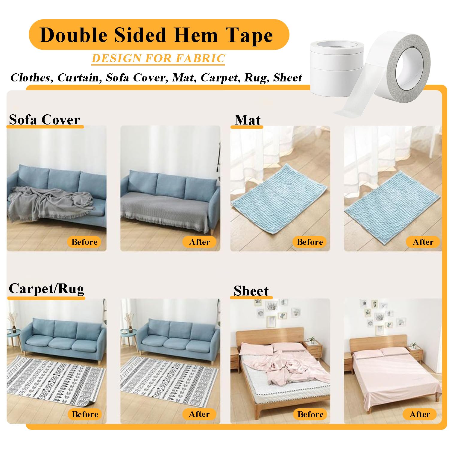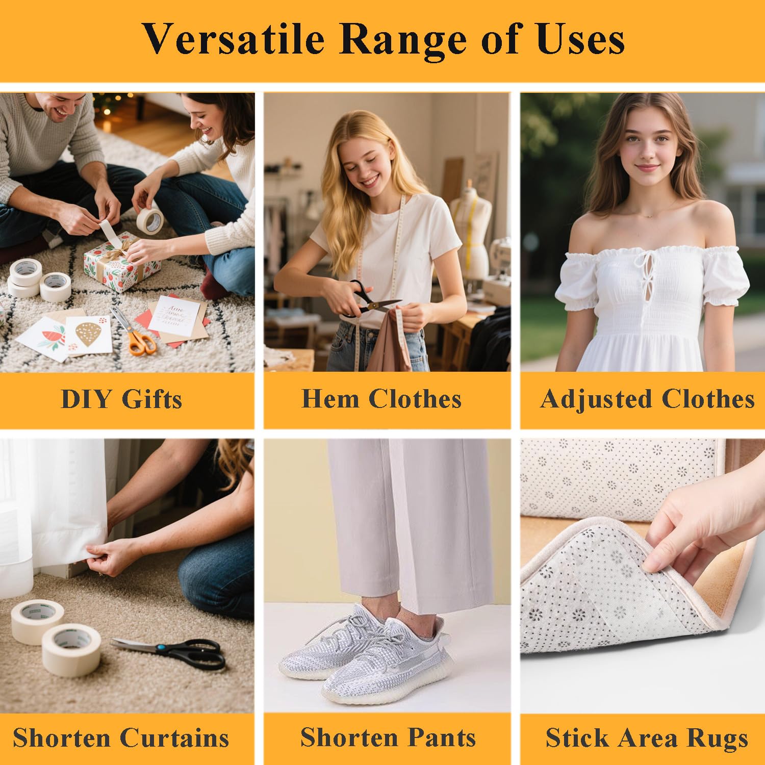 VERSATILE & RELIABLE:From curtain shortening and jean hemming to crafting quilts or securing rugs — the fashion tape handles household, fashion, and DIY projects. Repositionable & adjustable as you like. Best on light/medium fabrics.