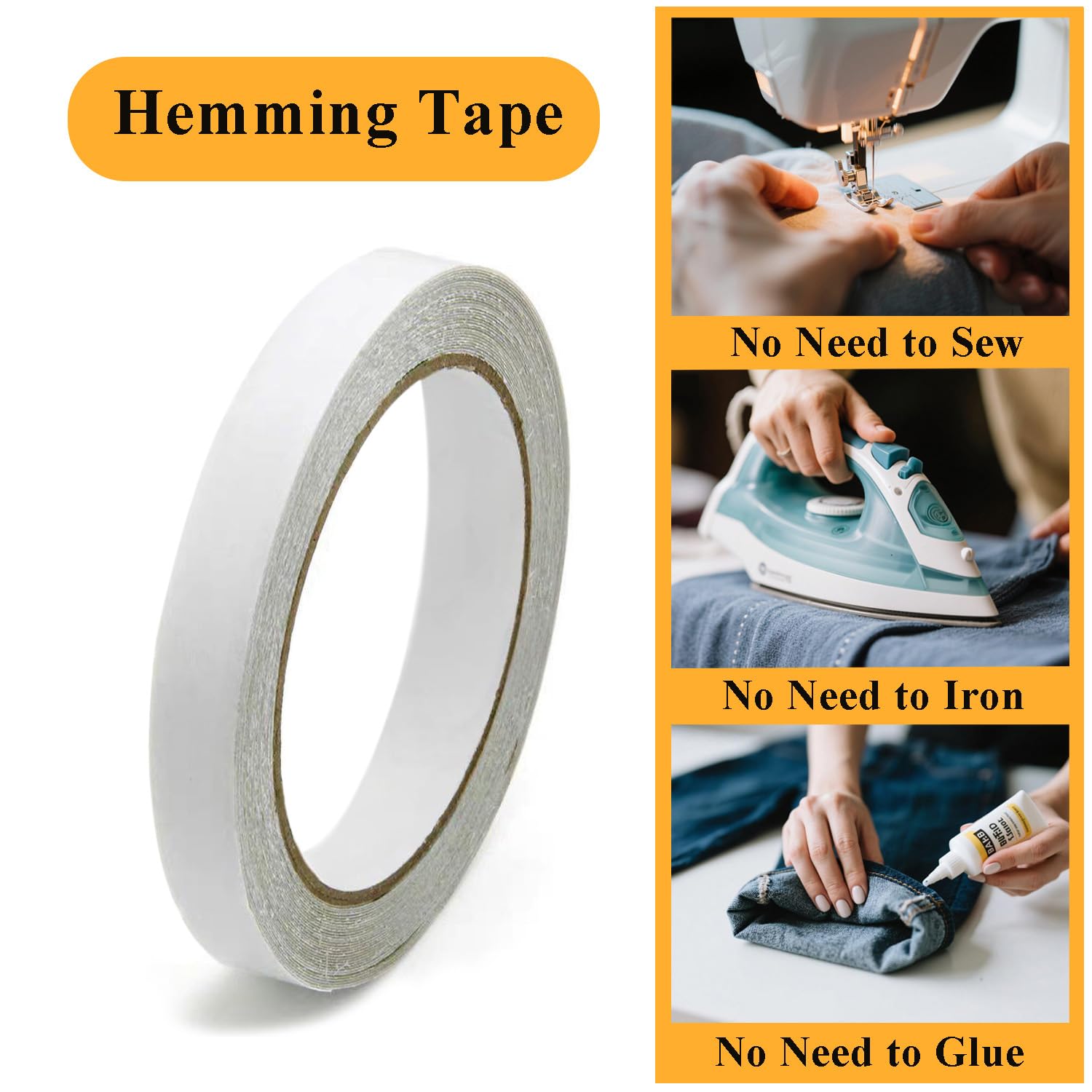 EASY TO USE: ① Cut to size ② Press on fabric ③ Peel, align, bond. Lasting holds on most fabrics — Zero tools required. For long hems: Work in sections to ensure straight application.