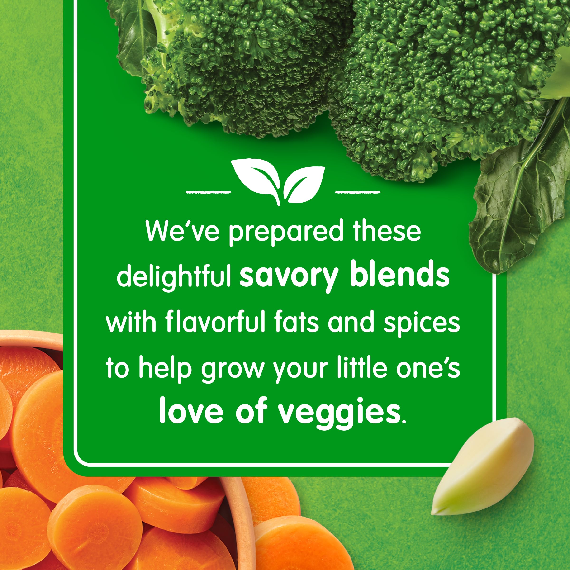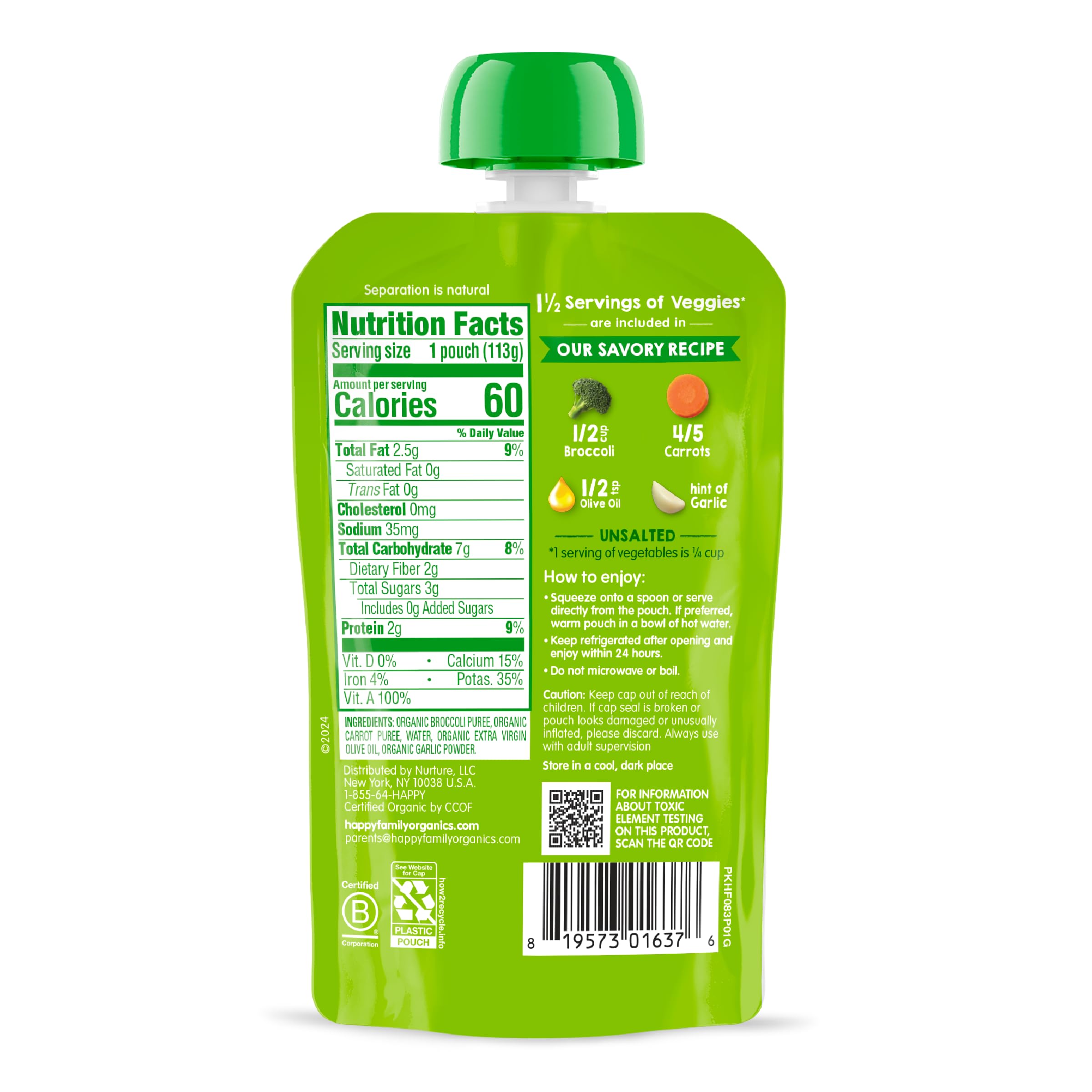 Happy Baby Savory Blends organic baby food pouches feature recipes made for babys age & stage. These blends are unsalted, packed with 1 servings of veggies, and flavorfully made with oil & spices.