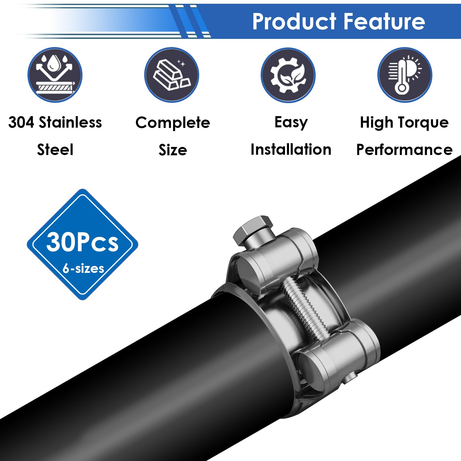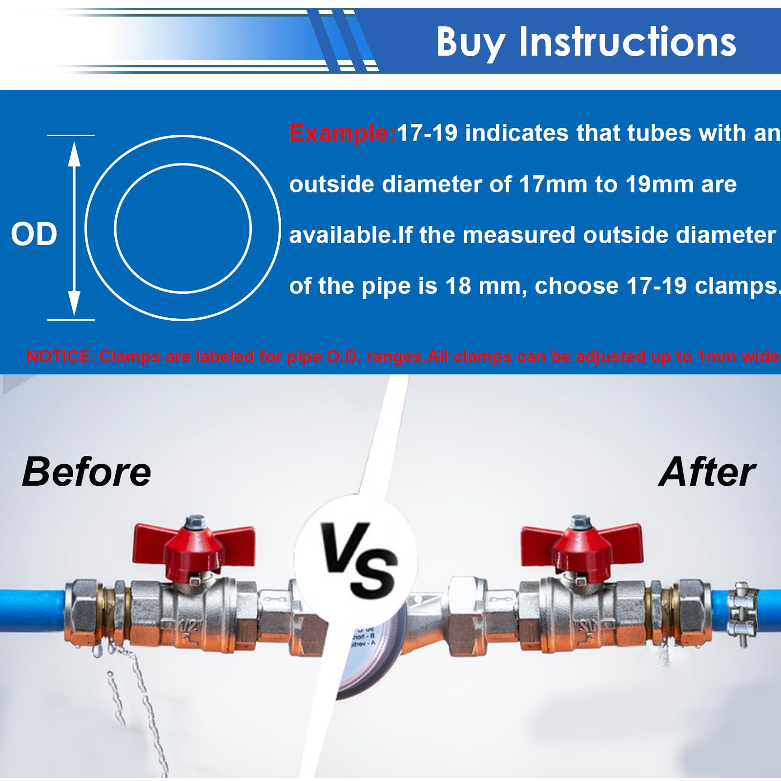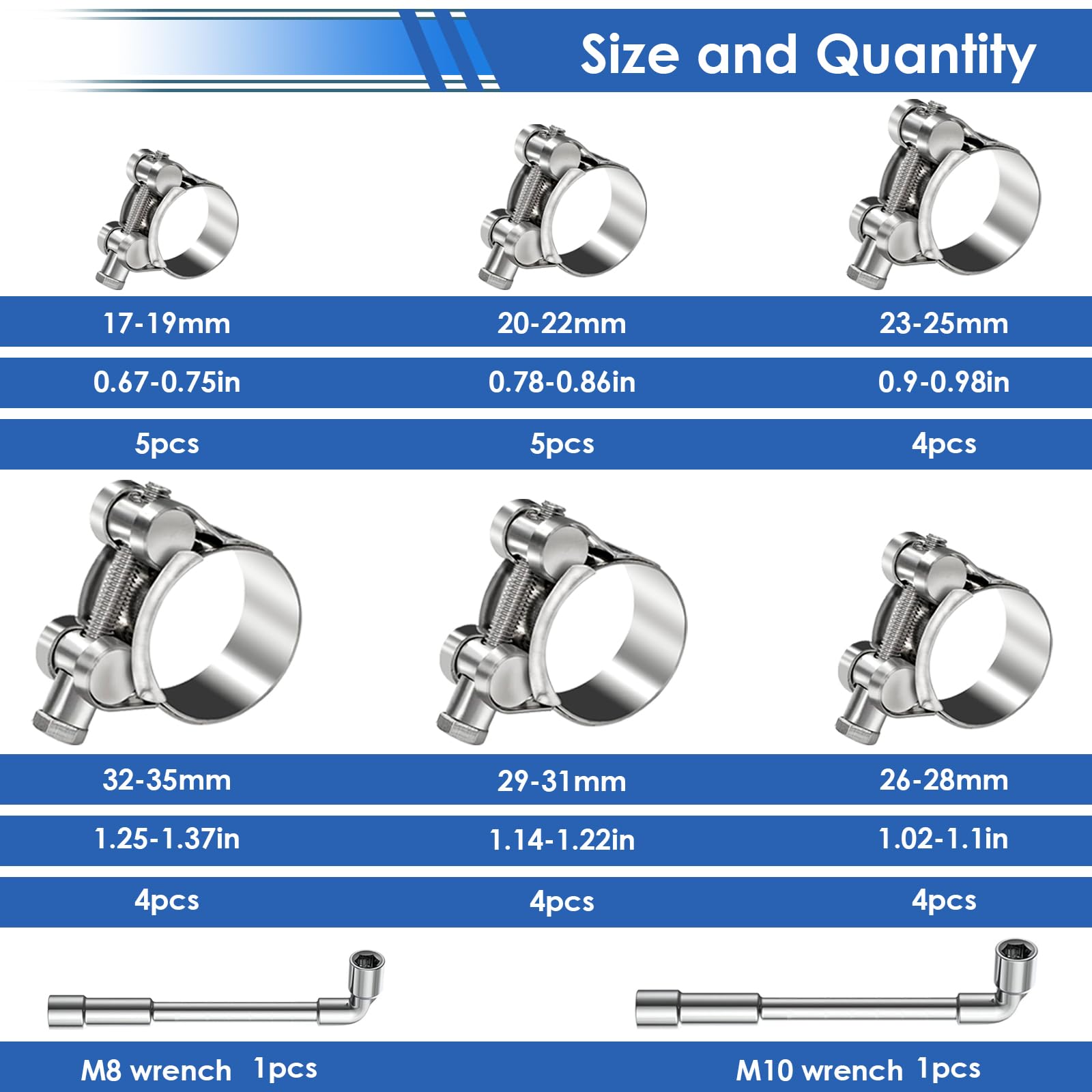 You Get: Hose clamps assortment kit have 28pcs different specifications,including 17-19mm(5pcs), 20-22mm(5pcs),23-25mm(5pcs),26-28mm(5pcs),29-31mm(4pcs),32-35mm(4pcs)