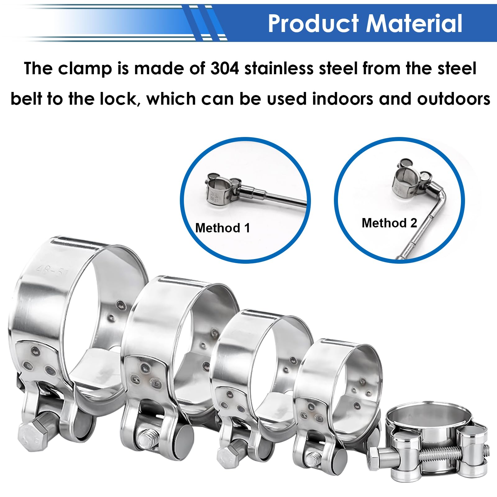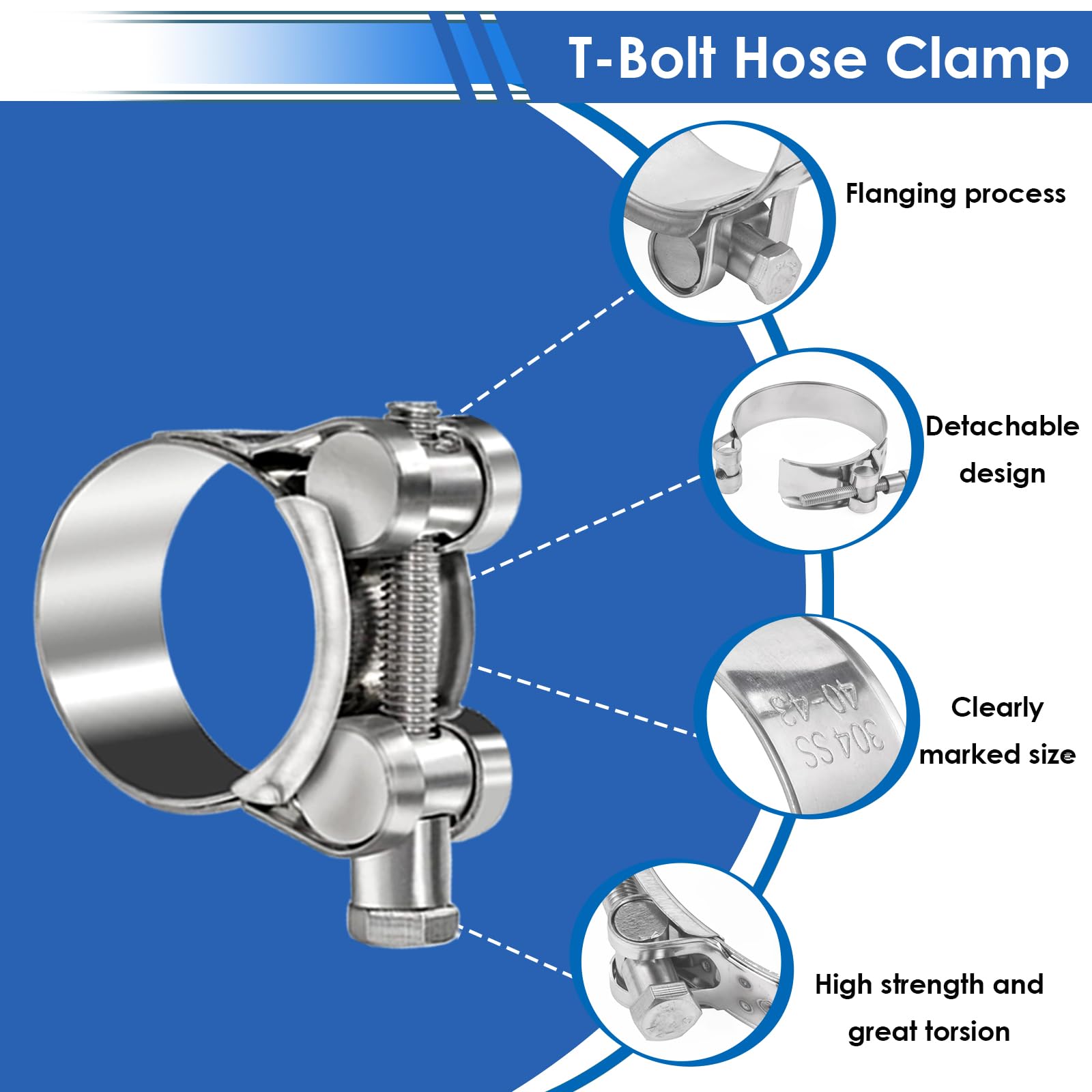 Material: T-bolt hose clamp is made of 304 stainless steel, which is corrosion-proof, rust-proof and enduring. The surface is polished, and the size is printed, which is clear at a glance and easy to find