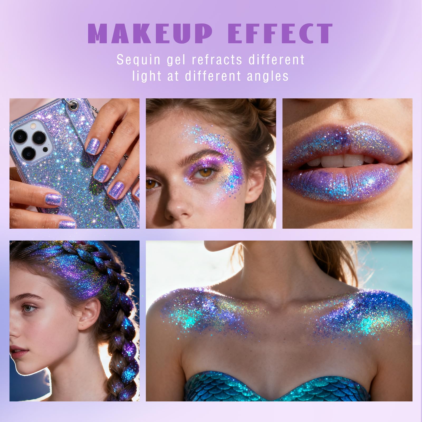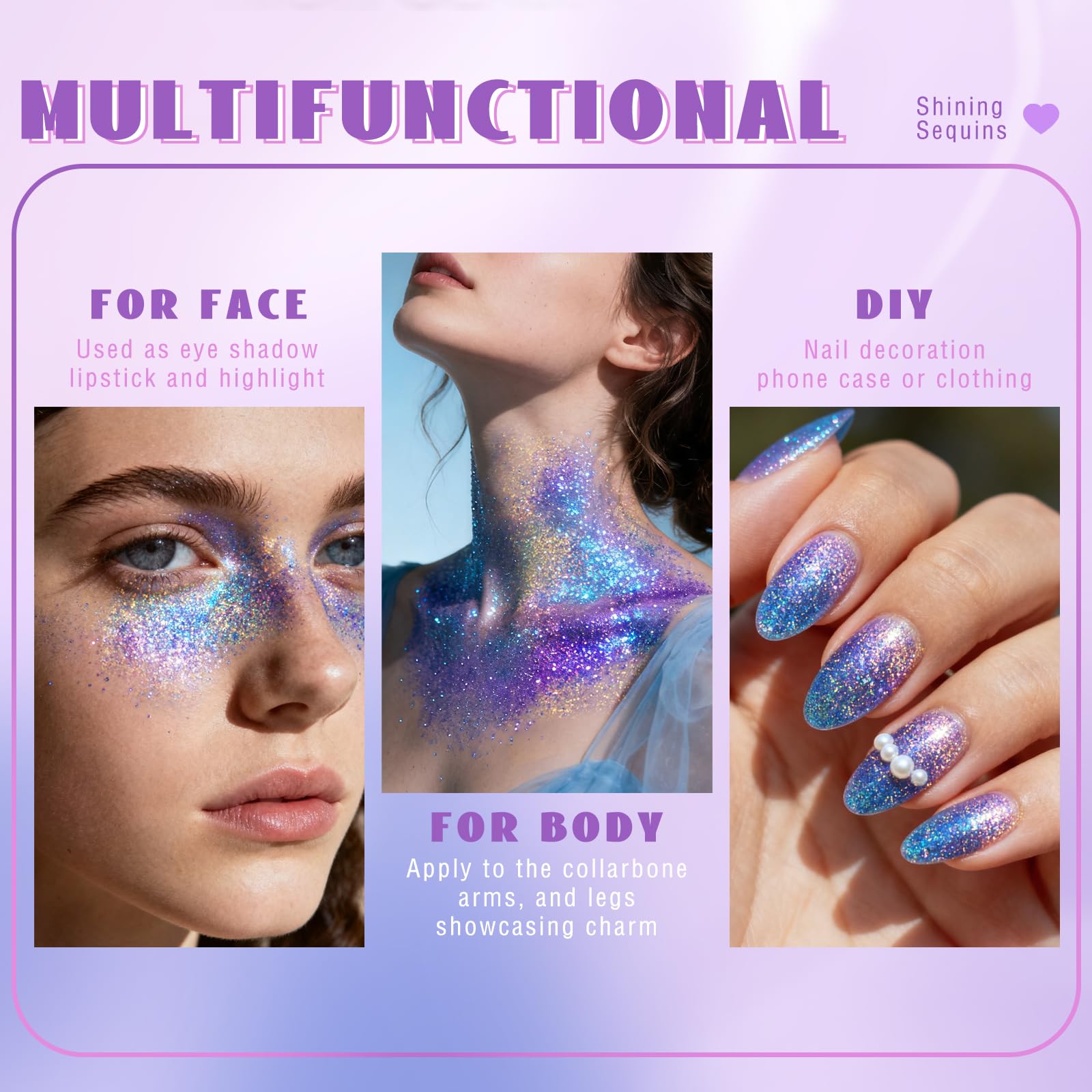 Wide Applications: This cosmetic chunky glitter gel is perfect for your body, face, eyeshadow, lips, cheeks, hair, nail art, and more, and perfect for rave hair accessories. It has a strong glowing effect in day and night, especially suitable for parties, weddings, stages and music festival, making you the glamorous focus of a passionate revelry