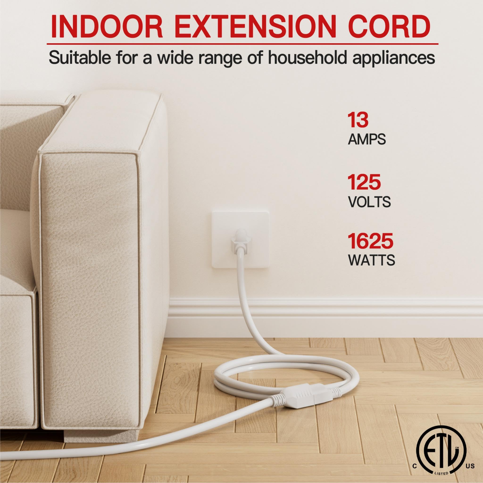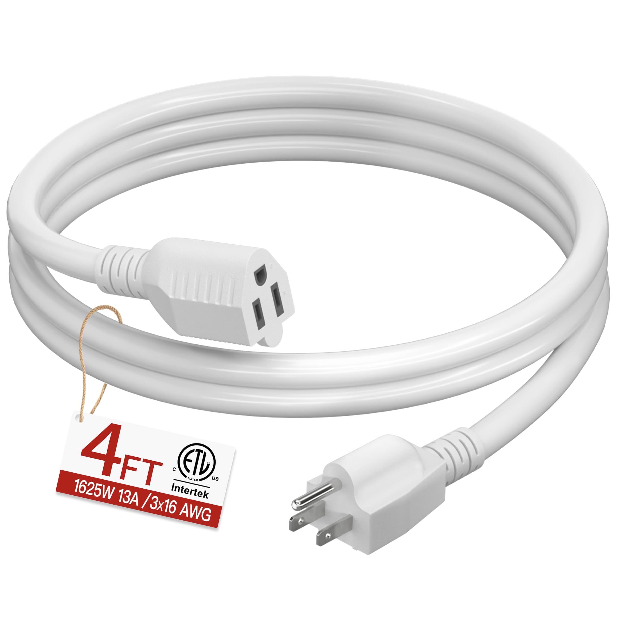 ETL Listed and Trusted: 4 ft extension cord rated 13 Amps, 1625 Watts and 125 VAC; Male NEMA 5-15P and female NEMA 5-15R; It is ETL/cETL Listed; Ensuring its compliance with strict safety standards; Each White extension cord 4ft passes a 1500V high voltage test before leaving the factory to ensure safety; Reliability and efficiency indoor extension cord are capable of meeting most electrical needs