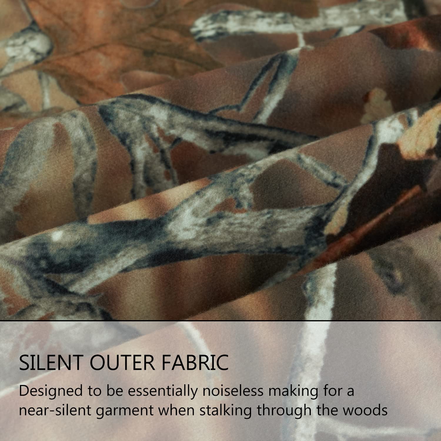 Silent outer fabric is designed to be essentially noiseless making for a near-silent garment when stalking through the woods