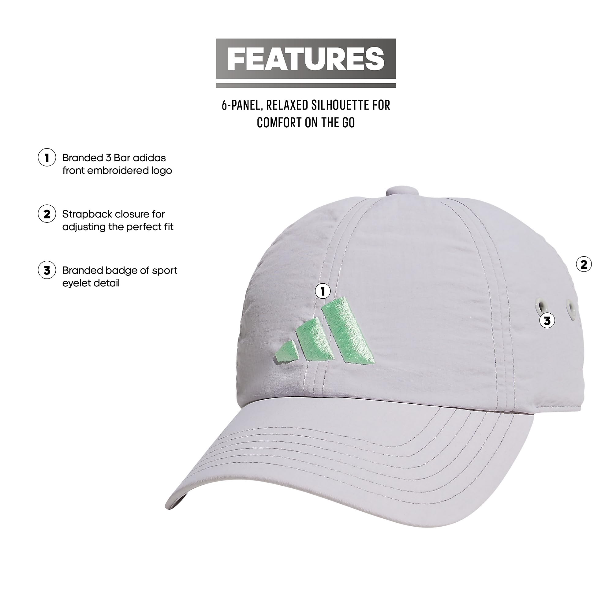 Description Grab this sport hat and you're ready to go. An embroidered adidas 3-Bar logo keeps your look sporty. Adjust the strap for the perfect fit. The nylon cap feels soft and smooth to the touch.