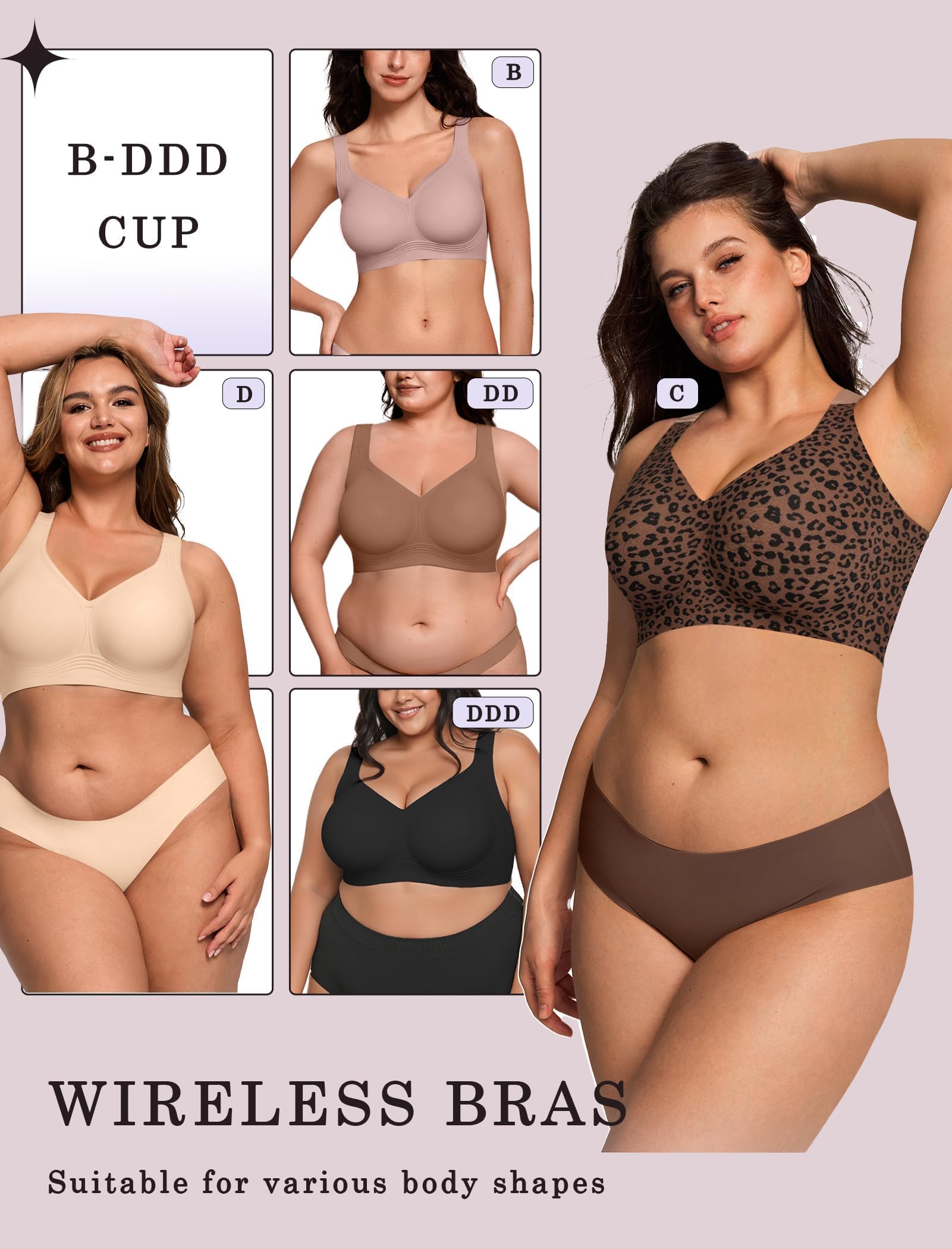 Back-Smoothing Design - This wireless bra combines an innovative widened side wing design with a 5-row, 4-buckle back closure (plus free extender) for adjustable support. Its U-shaped back and widened side wings seamlessly smooth back fat and underarm bulges. The high side ratio design securely wraps fuller busts to prevent side spillage, and the semi-fixed padding stays perfectly in place during both wear and washing for effortless comfort.