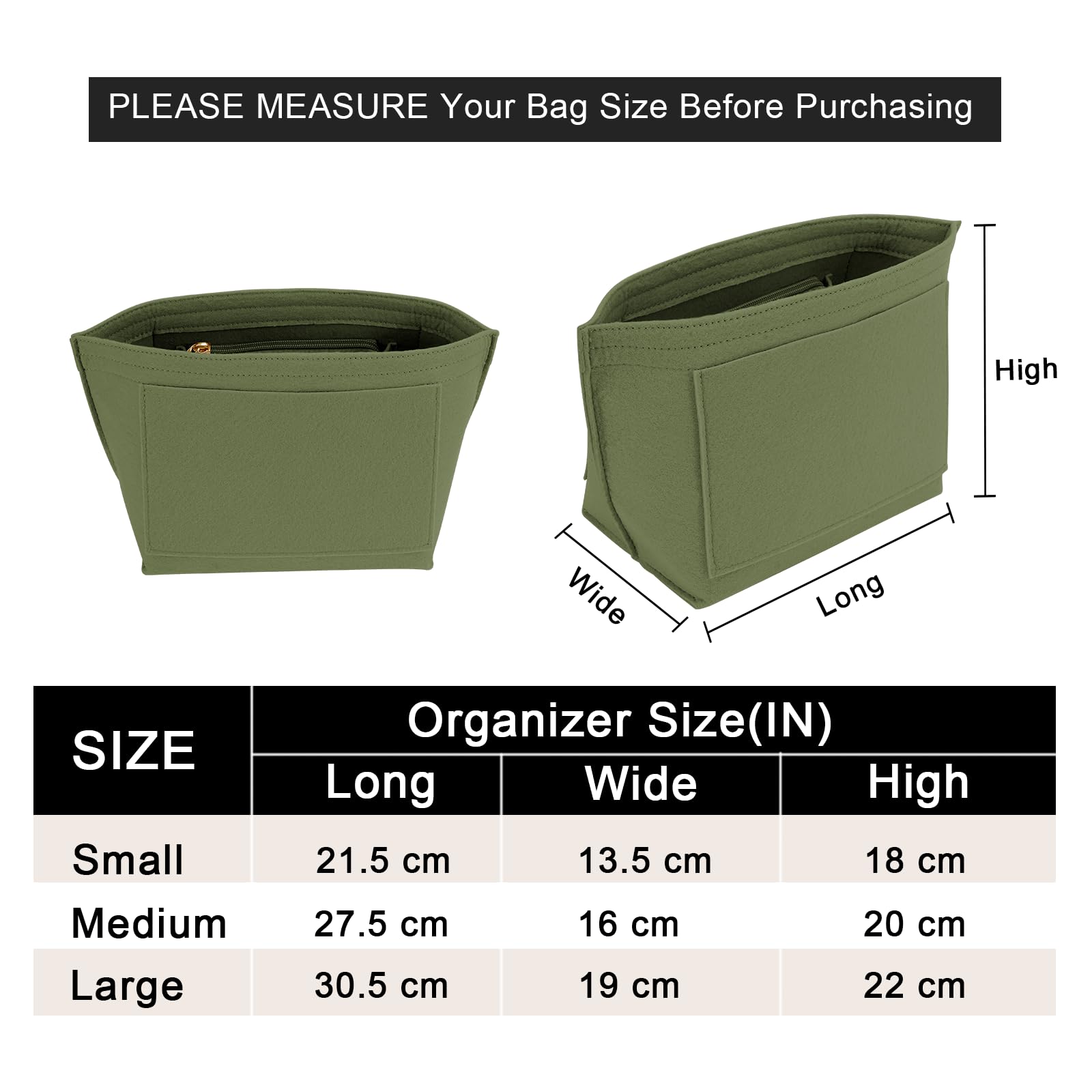 Size of the felt purse organizer insert - Medium: 10.8" (L)*5.9" (W)*7.9" (H) , suitable for Medium Size of long handle of Le pliage handbag, or similar size Tote Handbag,It will be more suitable if it is LESS than 0.5-1 inches to ensure a perfect fit,Please comfirm your bag size before purchasing again, thanks.