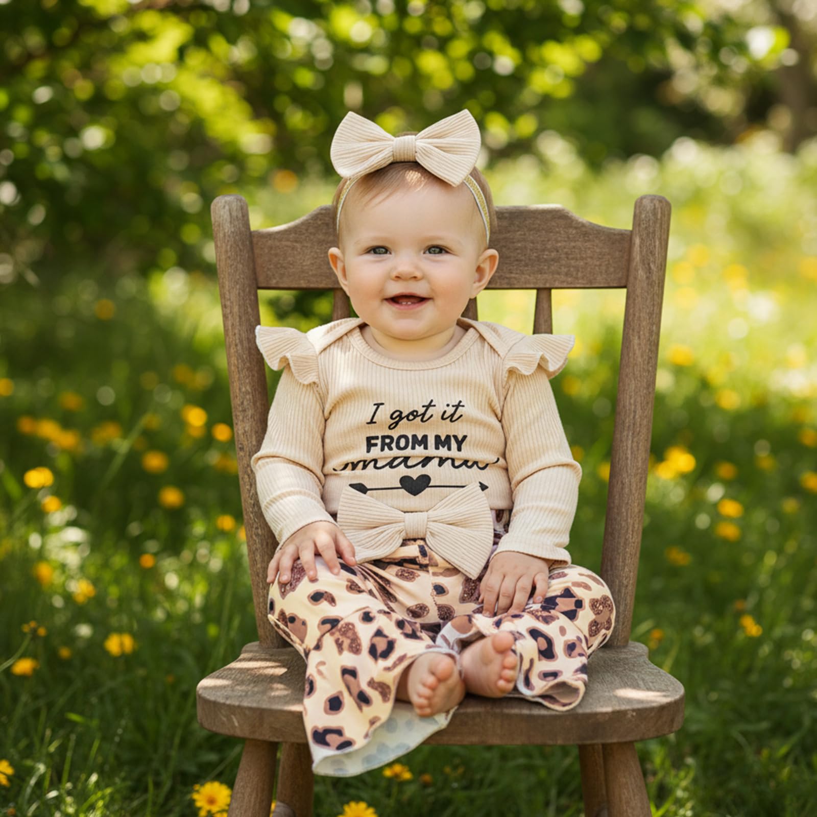 Design: Newborn girl clothes. Long sleeve, fly sleeve, front button, crew neck or lotus leaf collar design, snap closure for easier diaper changing, solid color ribbed knitted romper top matching with cow print/ leopard print flared bell-bottom pants, baby cowgirl outfits. Very adorable and fashionable