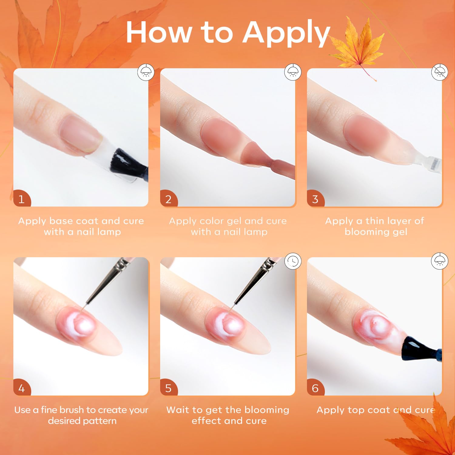 One Bottle Get All Design:The clear blooming gel can apply with any color gel, easy to create a stunning blooming effect. Apply blooming gel before color gel, then use nail art brushes to create your own fun, fancy, and elegant manicure in seconds.