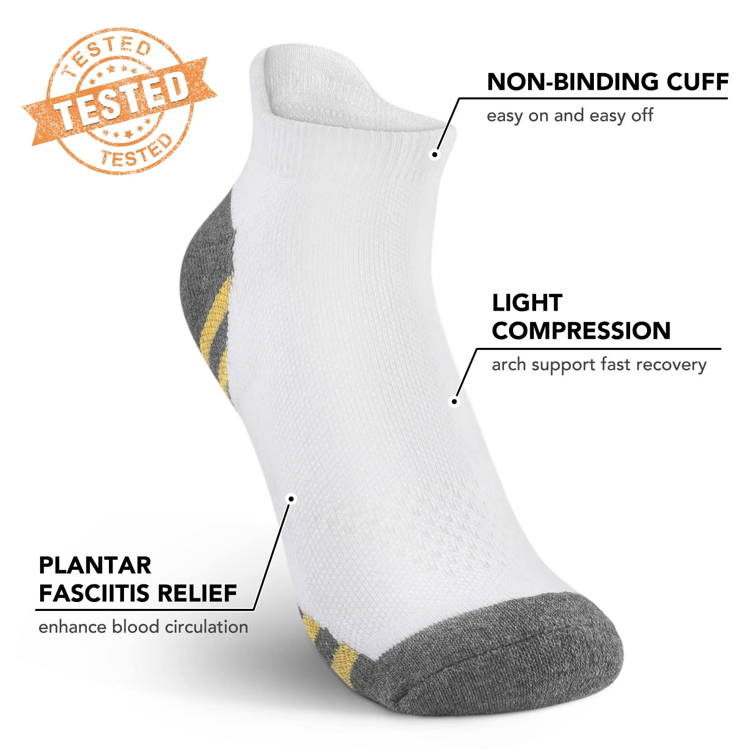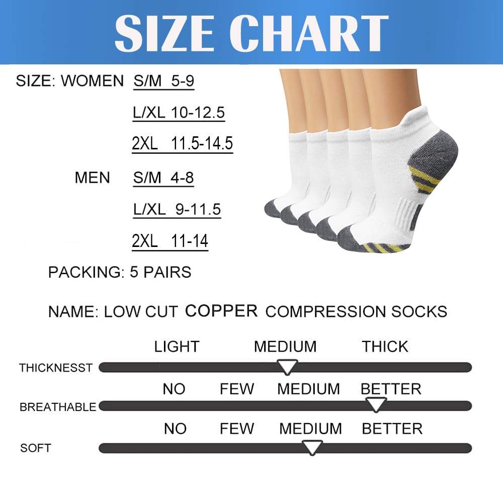 🏃IMPROVED COMFORT - Athletic copper compression socks can also be more comfortable to wear than traditional socks, as they provide a snug, supportive fit that can help prevent blisters and other foot injuries. The low-cut compression socks can also be made from breathable materials that help wick away moisture, keeping the feet cool and dry.