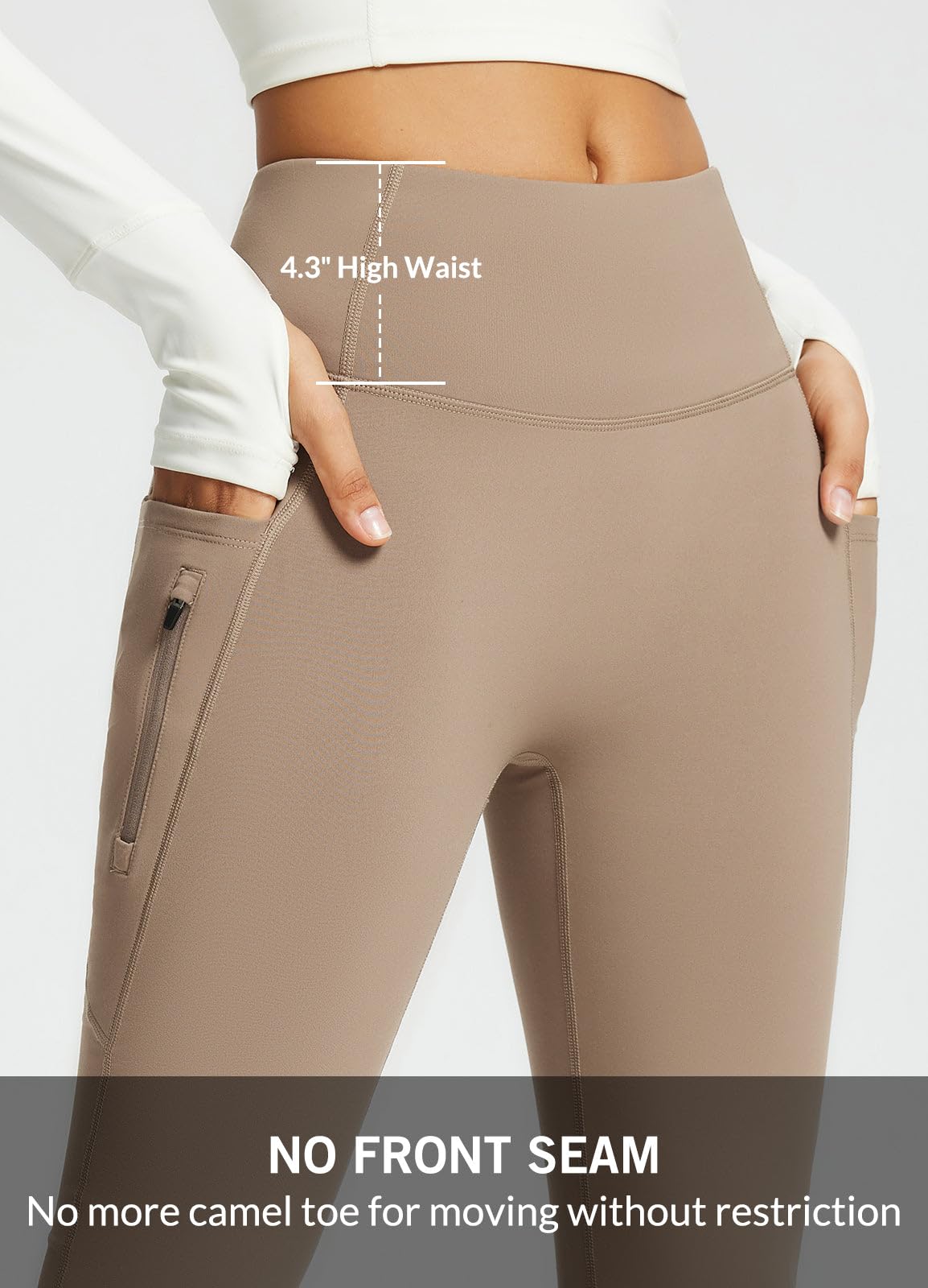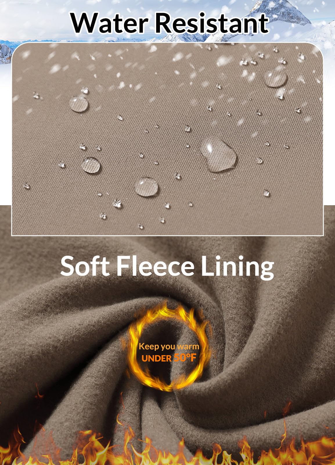 Feel the cold? Put on these fleece lined pants. These high waist yoga pants with pockets with soft fleece lining keep you super comfy and warm under 50°F, the water-resistant fabric is outside to better keep from wind and keep you dry on a snowy day.