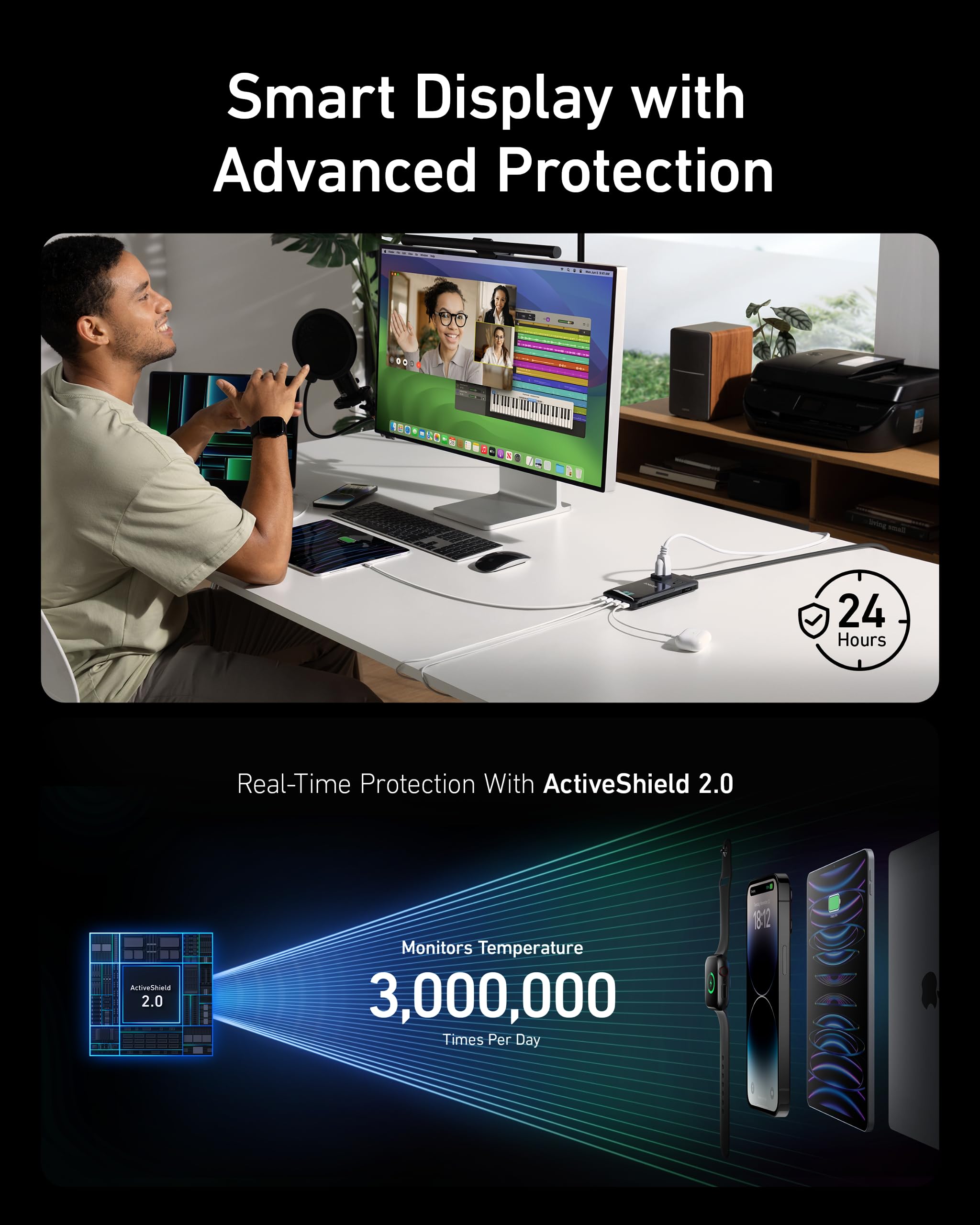 Stay Informed and Protected: Monitor and protect your devices with the smart display's real-time data monitoring, while ActiveShield 2.0 technology offers up to 3 million daily checks for superior protection. Please note that the screen will only light up when the product is connected to the power supply.