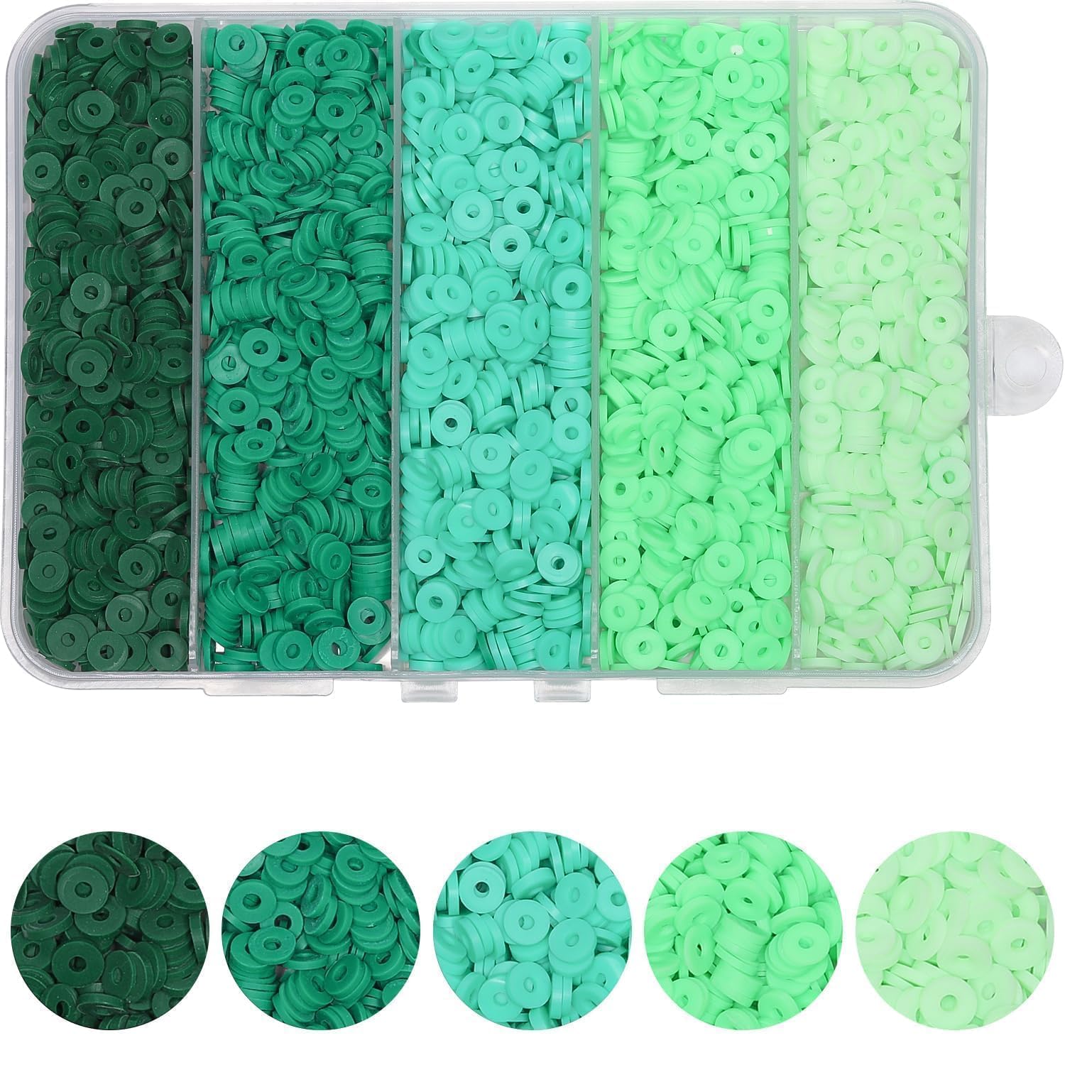Gradient Green Color:5 mixed green clay beads can better meet your diverse needs. Our selection of boxes allows each color of these heishi beads to be stored separately and not easily confused, These green clay beads are sized 6mm in diameter, 2mm in hole diameter.