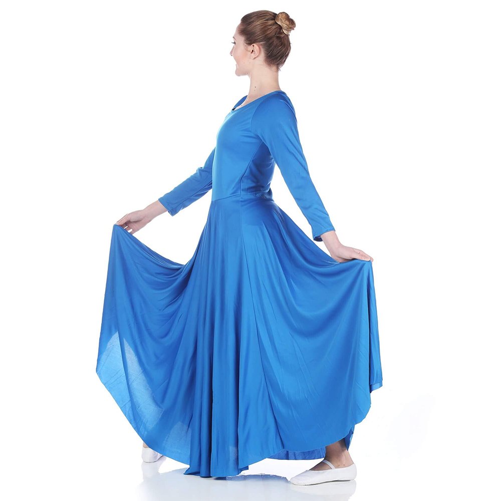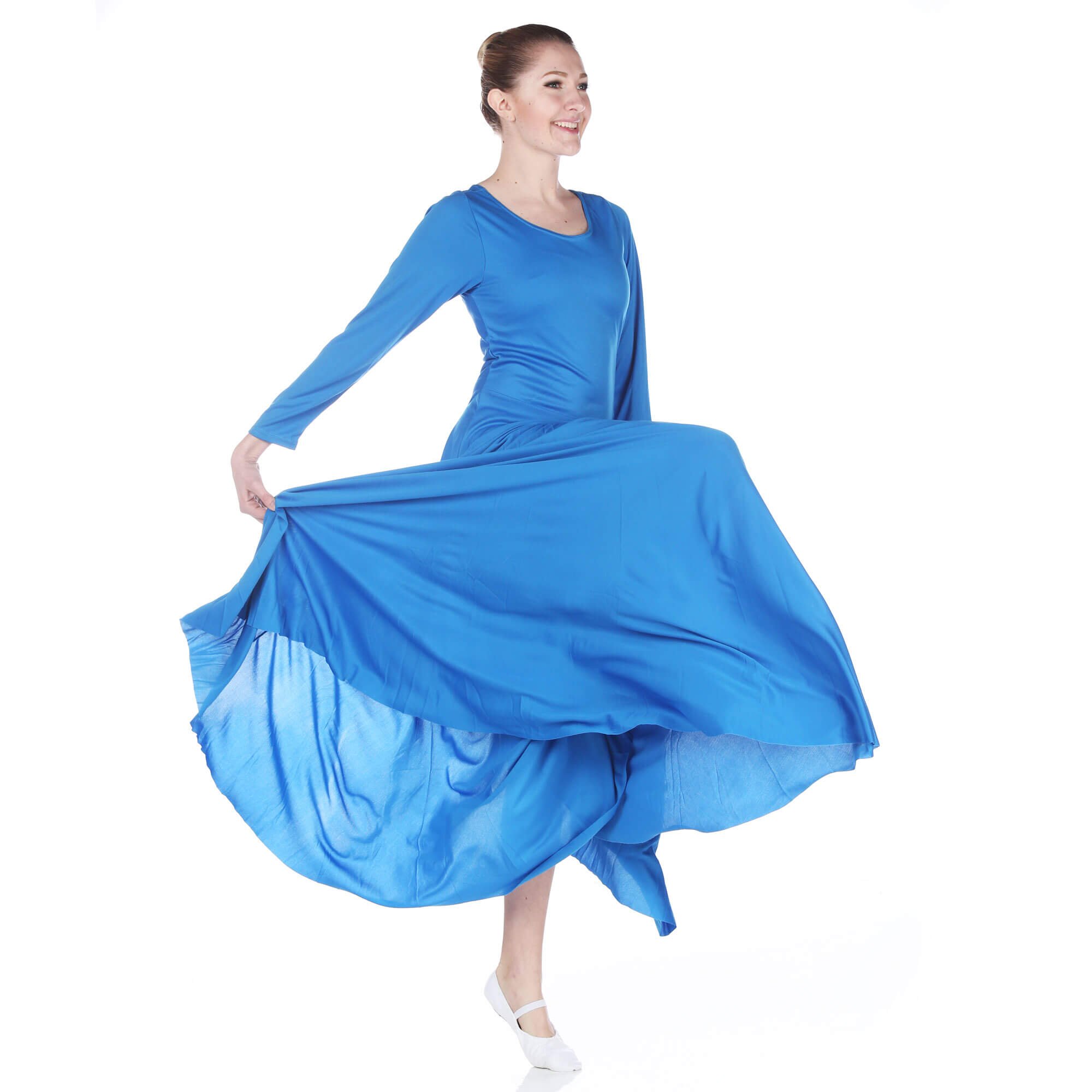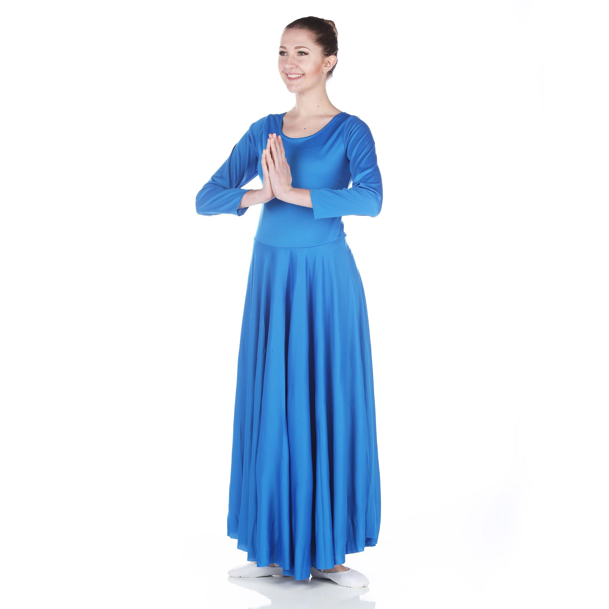 Description This is one of Danzcue's most popular dresses and features a soft and smooth polyester/spandex fabric, breathable, skin-friendly, lightweight, makes you feeling well. The upper torso of this dress is slightly fitted to show the grace and beauty of movement. Fitted in torso, loose in skirt, wide swing, give you enough space to move and give you the best comfort when dancing. The dress features a rounded neckline and long sleeve that allows it to be worn over any top or tunic combination, which is very suitable for worship praise dance, modern liturgical dance, ceremonies, etc. Sell by US Company.
