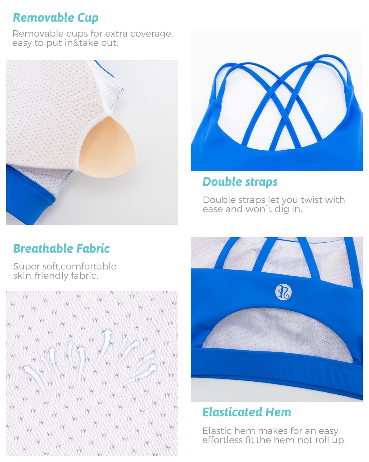 √YOUR SECURE FIT - Strappy design meets sporty style. Super soft scoop neckline with light, removable pads. Open cutout back styling sports bras for women medium support, widen band underneath the breast ensures a tight secure fit. Removable cups for extra coverage. The removable vertical cotton bra pads are easy to clean.The padded sports bra which always retains its shape and prevent bra bulges, caresses your figure to adjust to your curves.