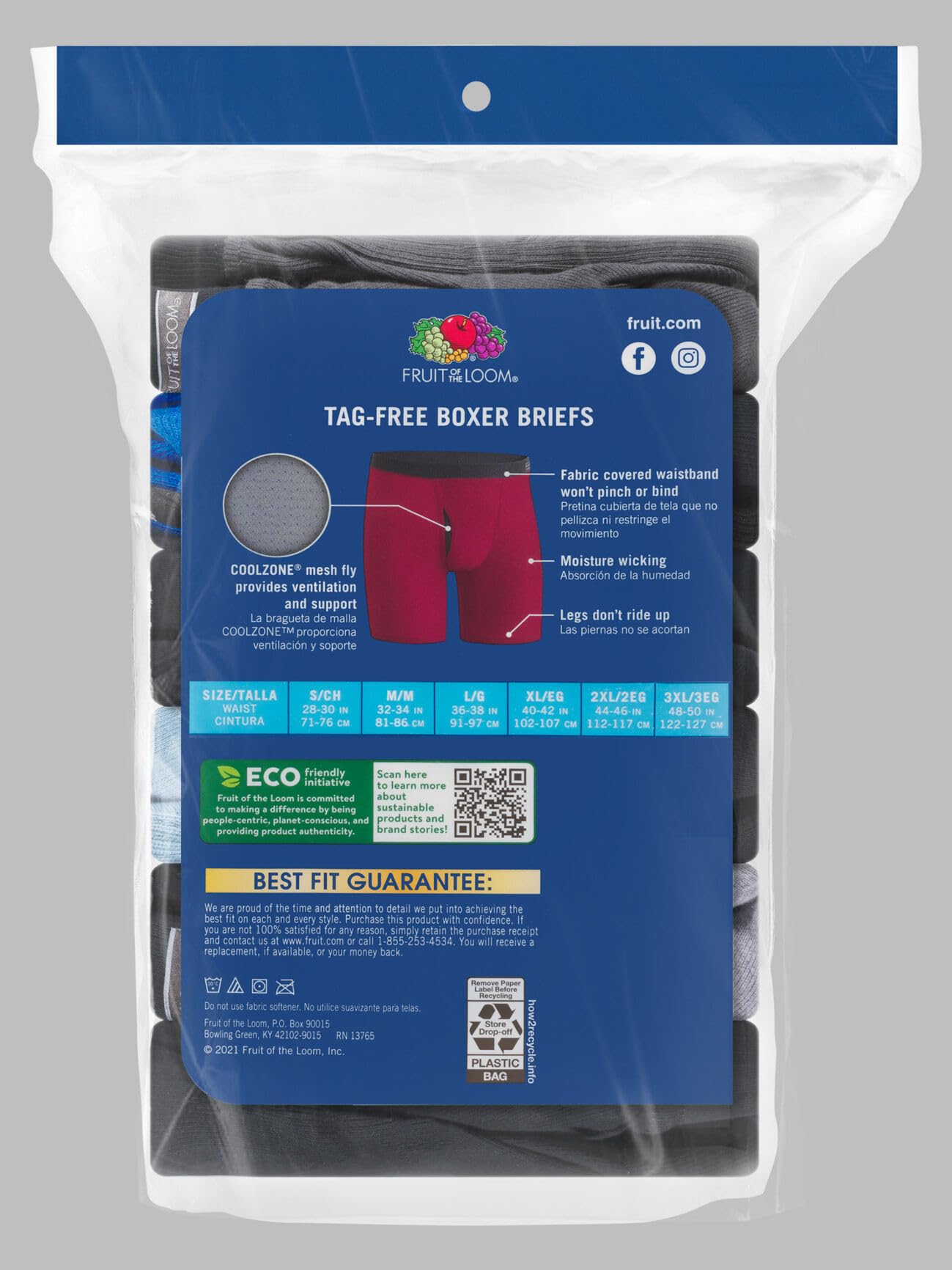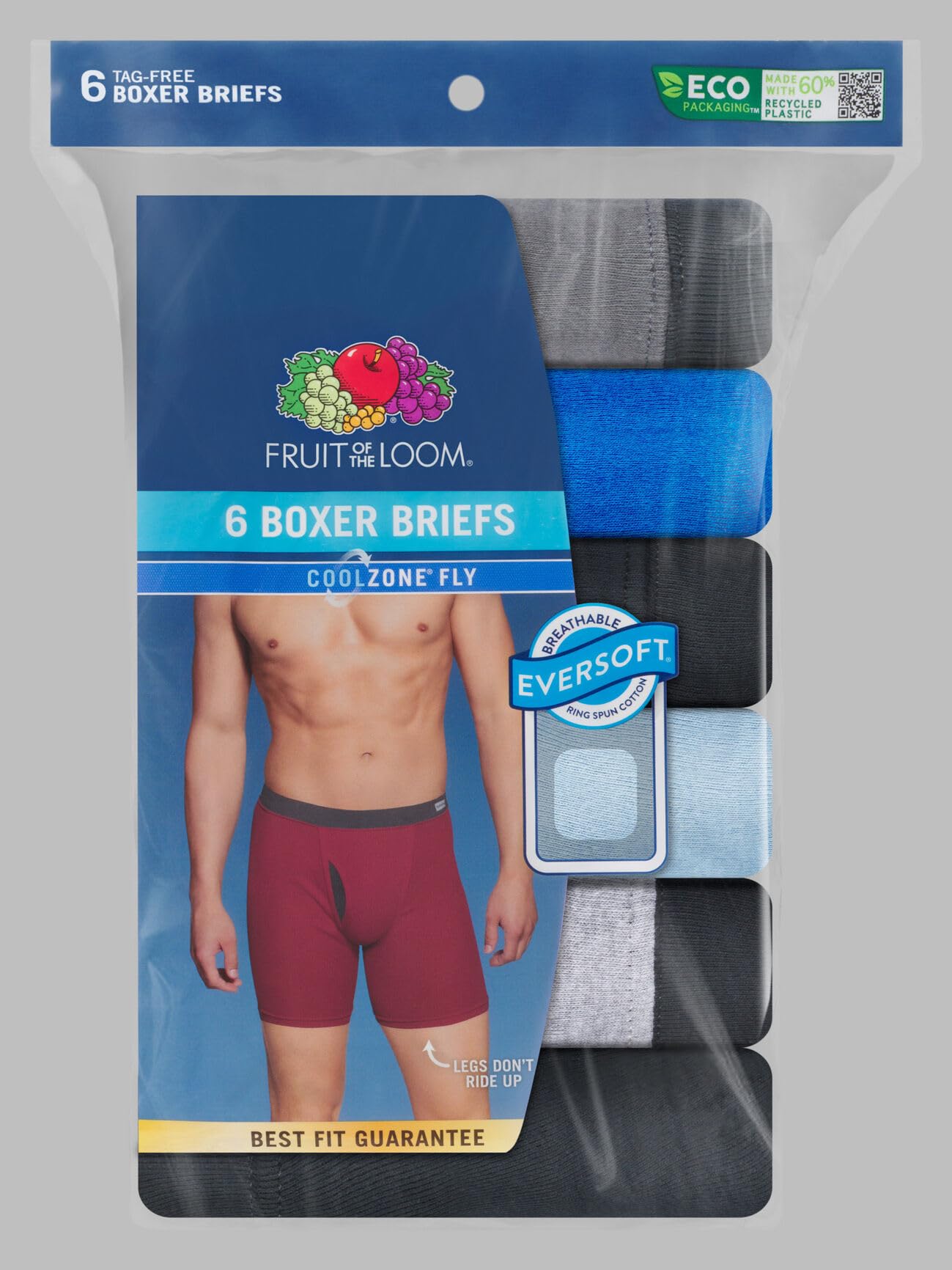 Description The Fruit of the Loom® cotton boxer briefs are better than ever! We've added EverSoft® fabric that provides premium softness wash after wash. This collection of black and grey CoolZone® men's boxer briefs are designed with a mesh fly that provides ventilation and support right where you need it most. With legs that don't ride up, and strategically placed breathable mesh, our CoolZone® boxer briefs will keep you cool and comfortable all day. Each pair is carefully crafted and includes moisture wicking benefits designed to help keep you dry and fresh.