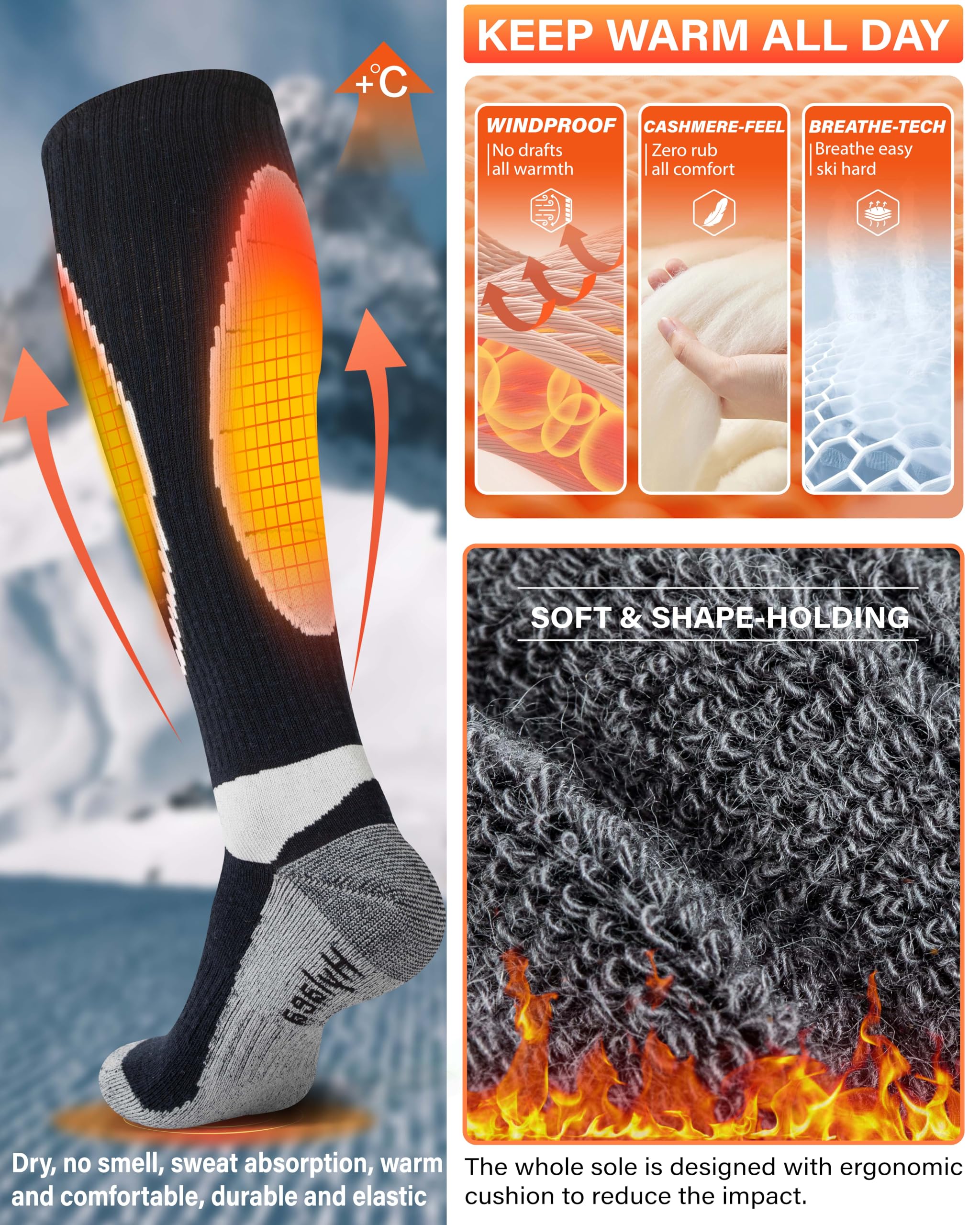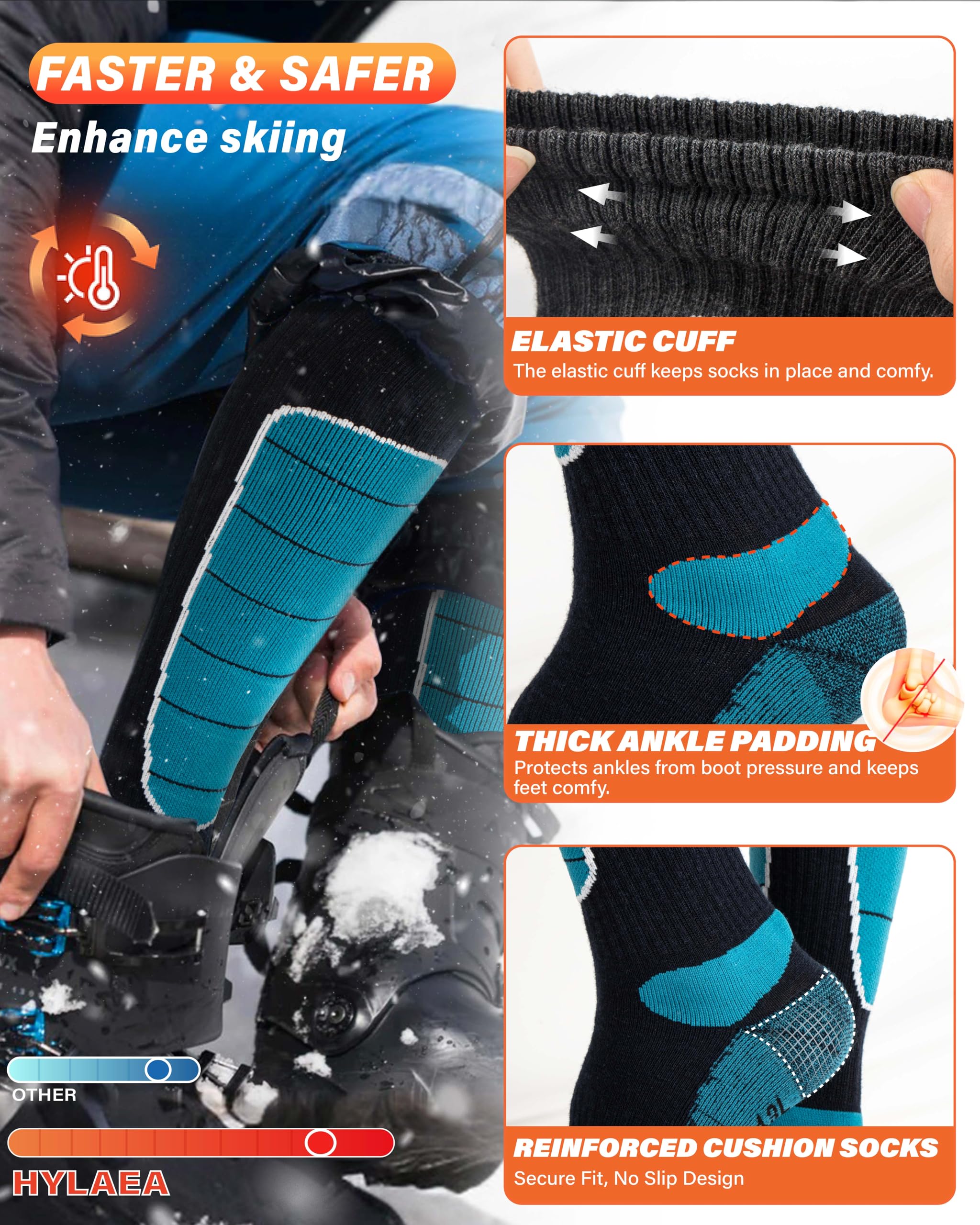 SOFT & COMFORTABLE: These thick-knee high socks feature thick terry loop in forefoot, heel, and toe specifically engineered for minimized friction and shock absorption. The snowboard socks added just the right amount of targeted padding on the front shin area where skiers and riders often need a little more cushion. This ski accessories are great options for skiers and riders who know a great day on the mountain starts with a great pair of socks