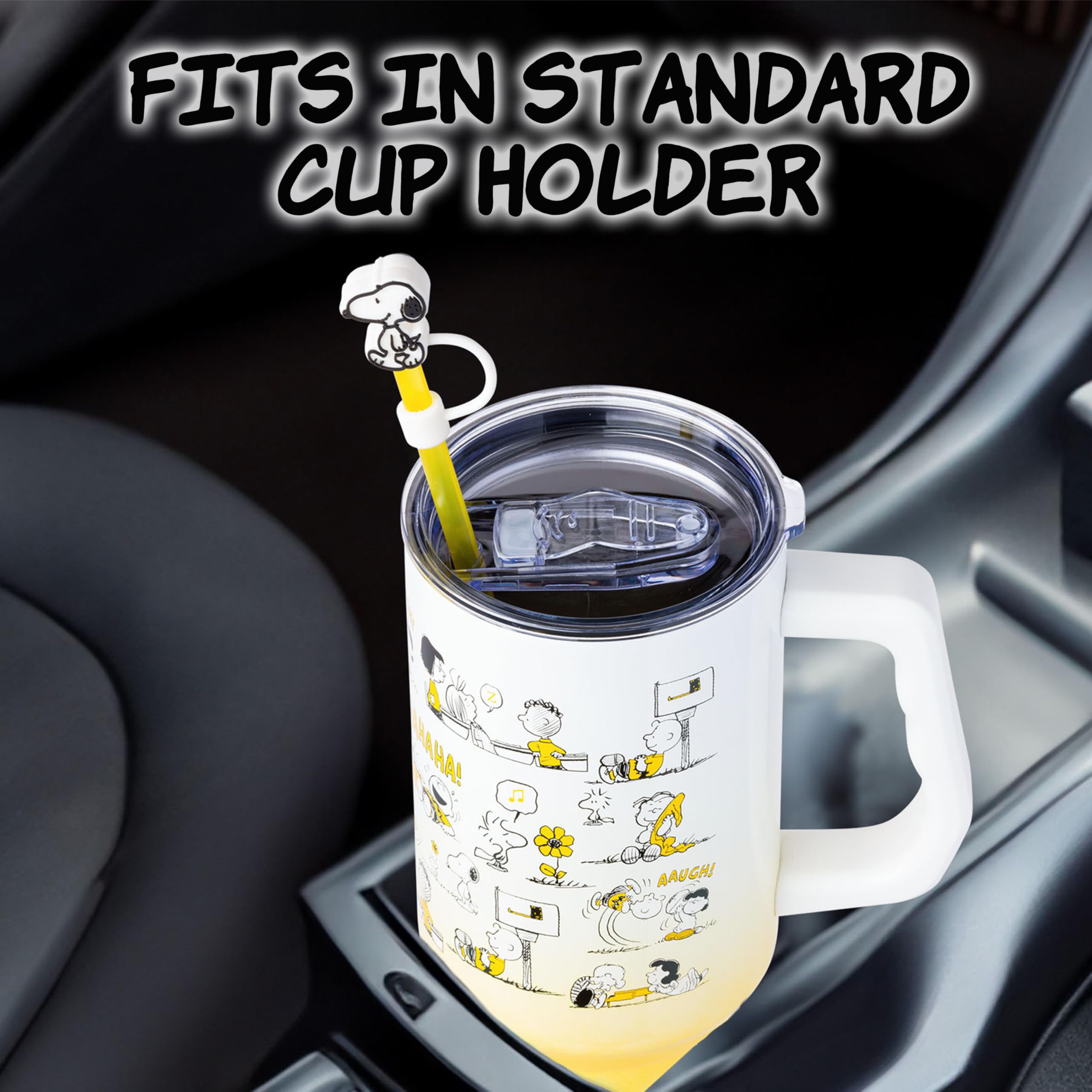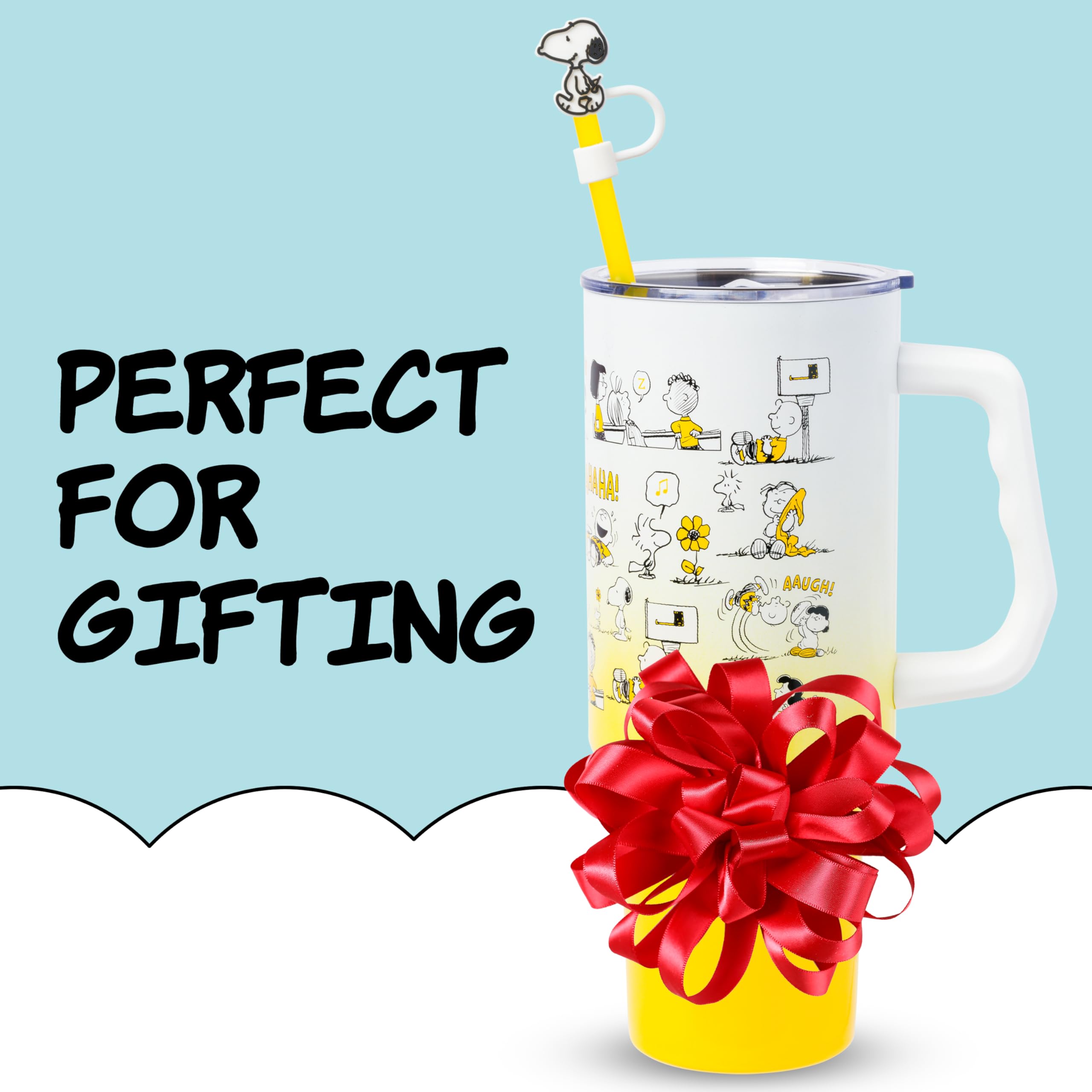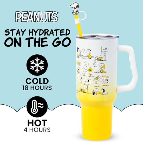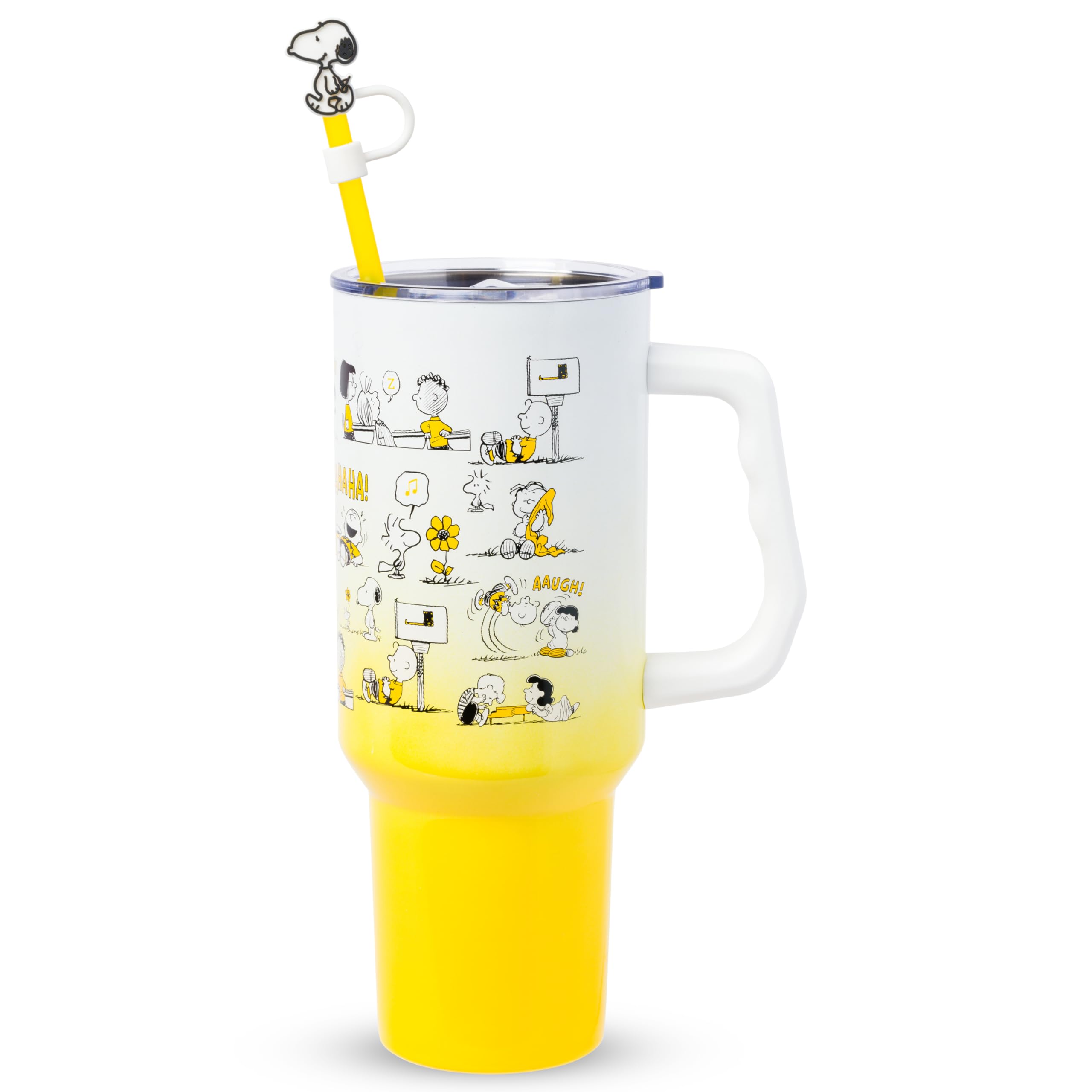 LARGE AND DURABLE: This 40oz stainless steel tumbler features a yellow ombre design with the Peanuts gang, including Charlie Brown, Snoopy, Woodstock, Lucy, Sally, Linus, Pig-Pen, Franklin, Marcie, Peppermint Patty, and Schroeder.